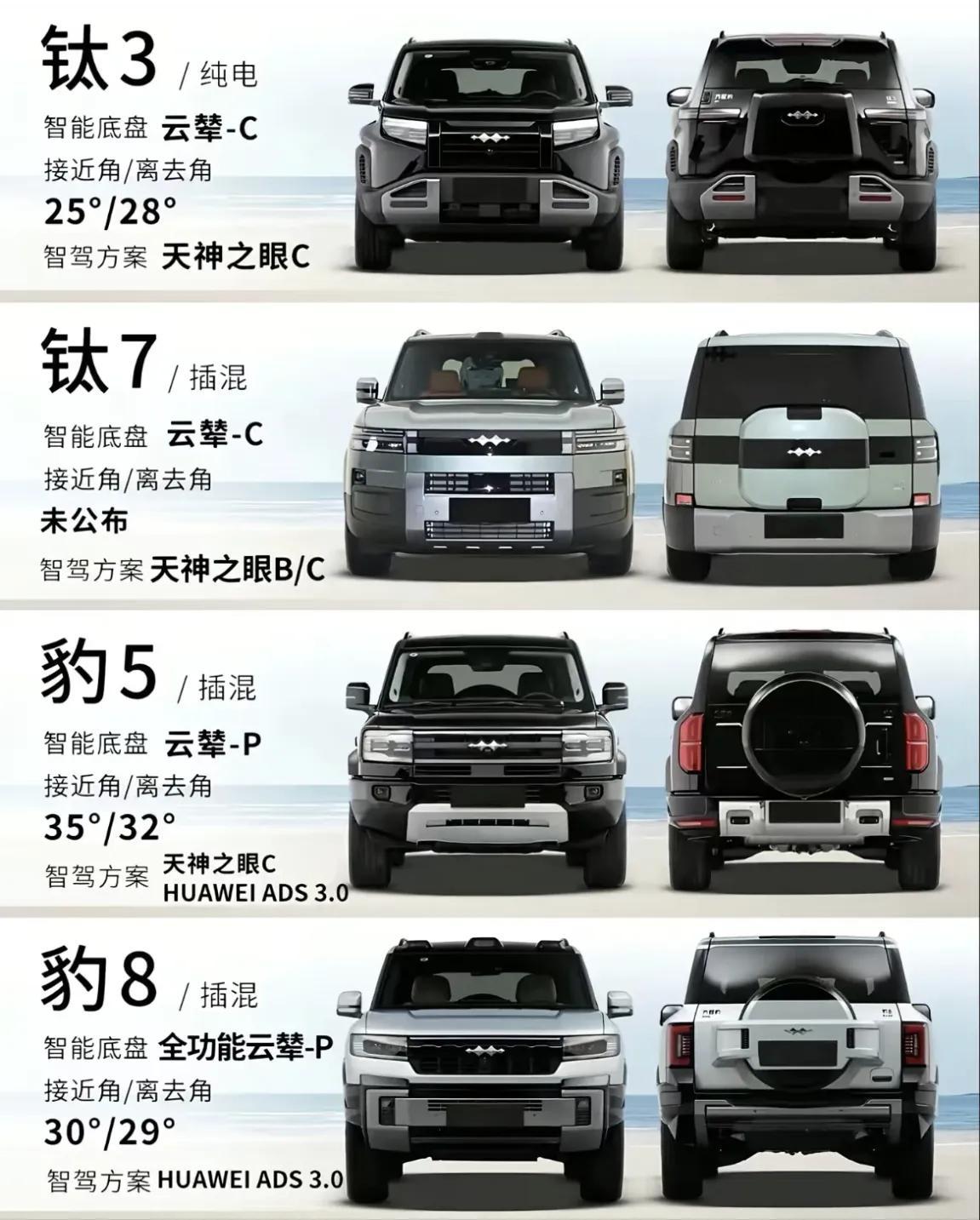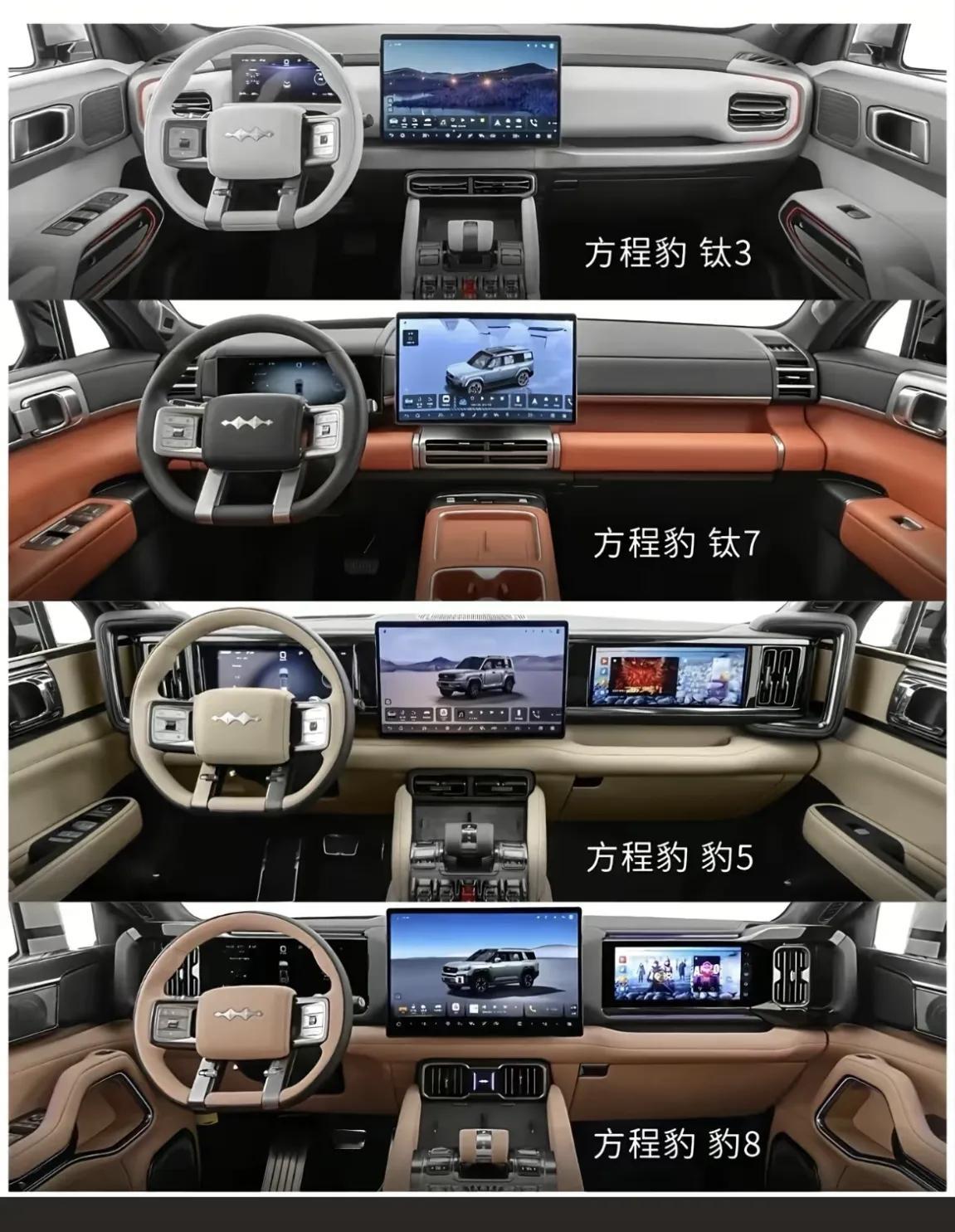 方程豹钛3钛7豹5和豹8怎么选?直接上结论!1:钛3:13.38w起售价的纯电SUV,家里有其他车,或者为了上下班通勤可以买,个人觉得比元plus好点。2:钛7:中大型混动SUV才17.98w,要知道这之前可是唐的价格,轻度越野或者不越野的,完全可以闭眼买3:豹5:现在的豹5加量不加价,虽然也没有降价,越野车搅屎棍,被黑的最惨的车,正说明了他的实力。4:带华为智驾却卖的不好的车之一,很大很帅,这个价格其实也可以买,但是竞品也多。5:考虑纯电买钛3,混动建议买钛7,喜欢越野买豹5,商务或者重度越野,预算又够的直接上豹8。