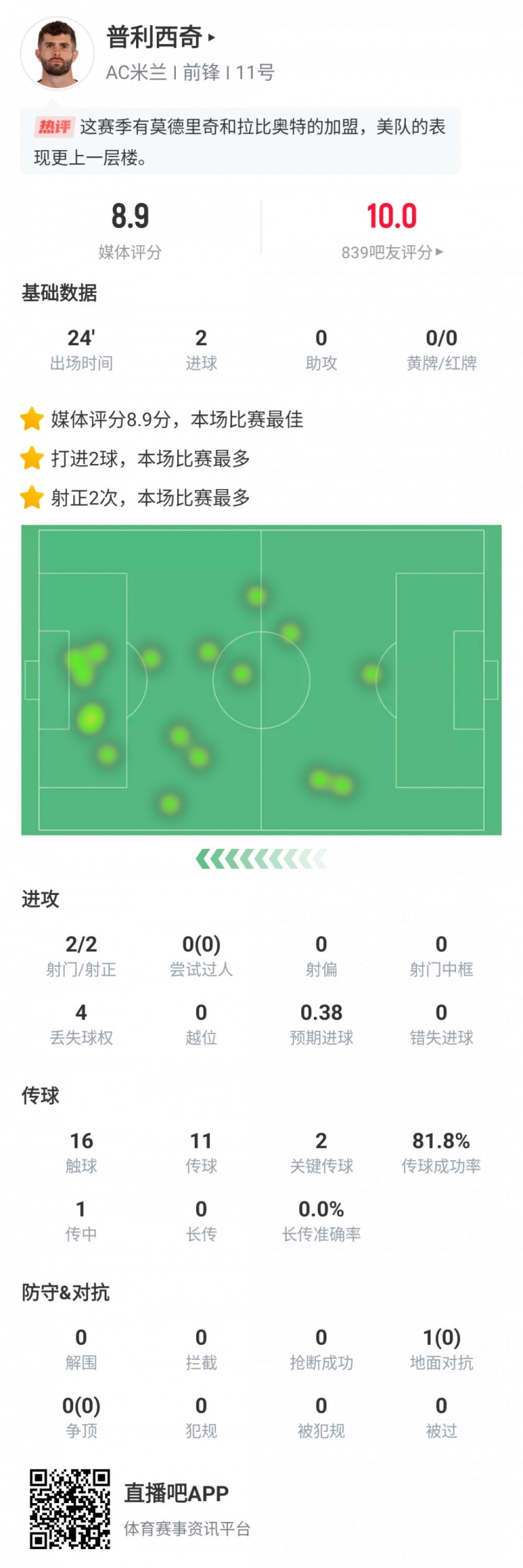 直播吧12月9日讯米兰在本轮意甲3-2逆转都灵,普利西奇替补完成梅开二度,以下是他的个人数据。