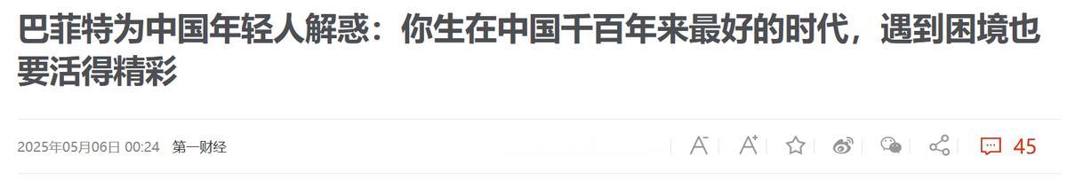 美国彻底慌了?2025年5月6日,巴菲特称:中国年轻人生在中国千百年来最好的时代