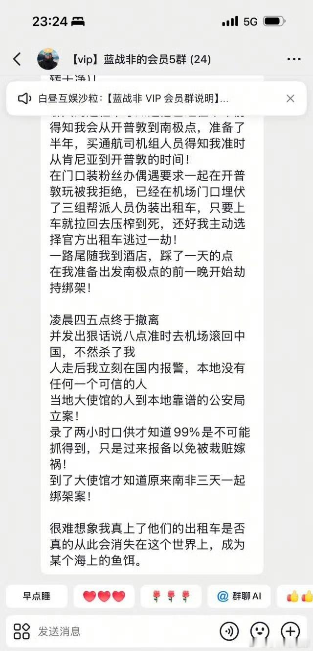 蓝战非被绑架旅游大V博主蓝战非,在南非开普敦筹备南极点行程期间遭遇绑架,事发于其入住的五星级酒店内。绑匪为1名中国人伙同2名黑人,提前半年筹备,买通机场及酒店工作人员获取其行程与入住信息,深夜用房卡开门闯入,持刀将熟睡的他劫持约四五小时,期间逼迫其转账、办理网贷,并收集指纹、毛发、精液等物品以伪造案件相威胁。最终绑匪于凌晨撤离,蓝战非事后已通过大使馆协助在当地报案,目前人身安全。蓝战非
