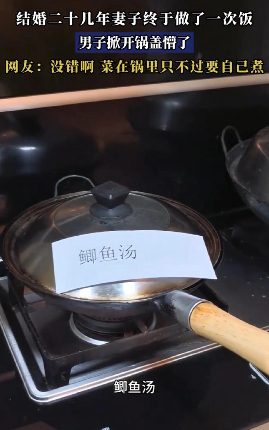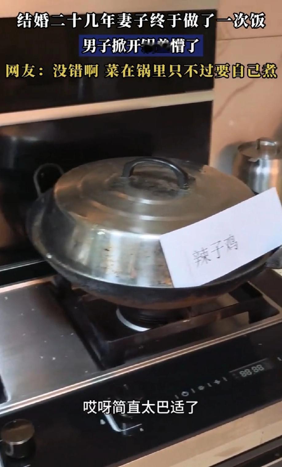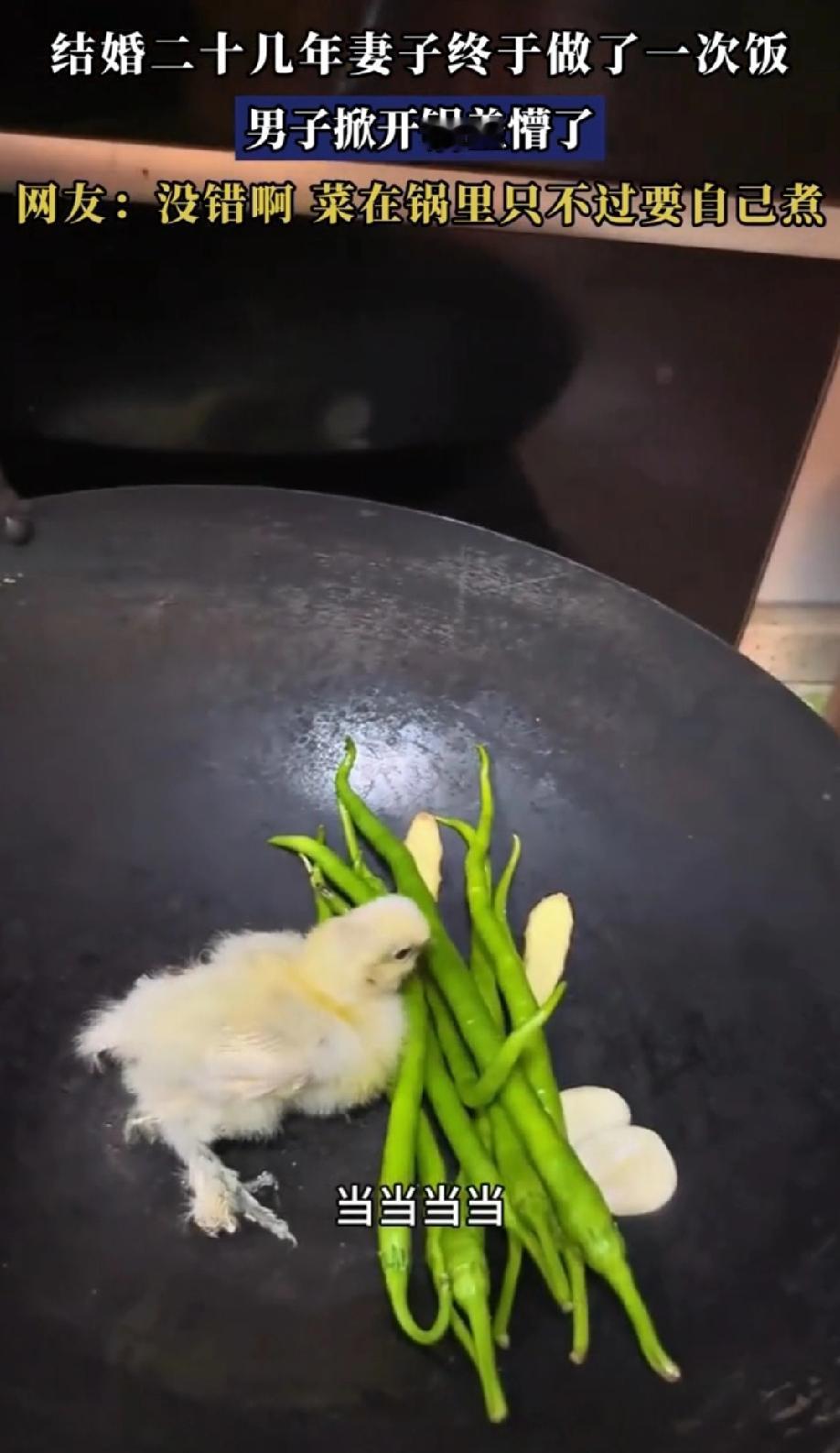 男子感慨结婚二十几年,妻子终于给他做一次饭,感动不已。鲫鱼汤、辣子鸡,简直太巴适了!结果男子打开盖子,这不仅是生的,还是活的,鸡还需要时间长大! 只能感叹,中文博大精深啊。菜在锅里跟菜炒好在锅里两个意思。食材很新鲜,还活蹦乱跳的,全都是真材实料! 其实妻子的意思是今天她想吃鲫鱼汤、辣子鸡,让老公看到菜单,食材就赶紧做! 肯定是因为锅太小了,放不下大鸡,难为妻子特地去找了小鸡仔。 这种相处模式,看着就让人羡慕。夫妻感情好好,他们在一起生活肯定很幸福!