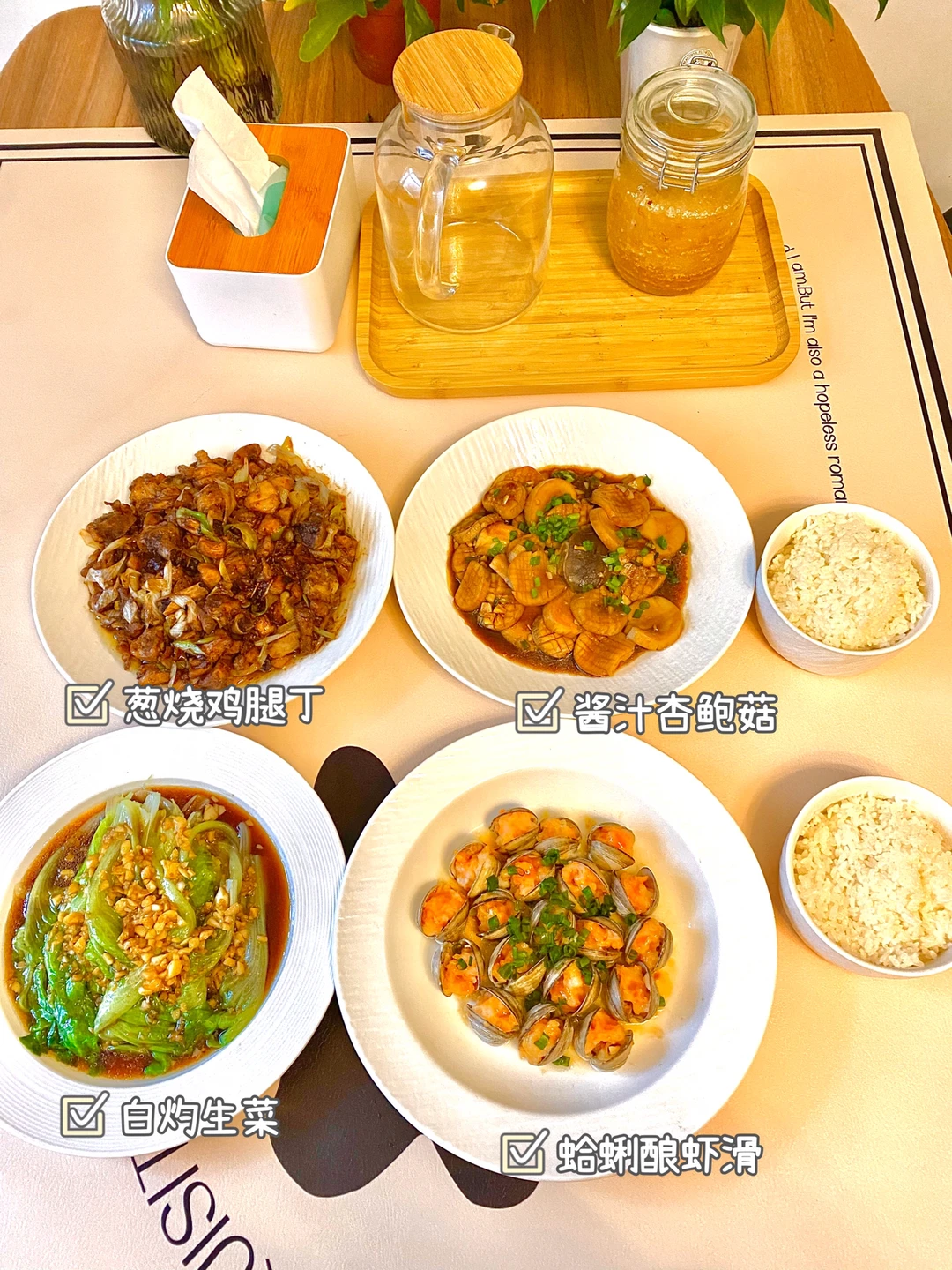 1⃣️葱烧鸡腿丁、白灼生菜