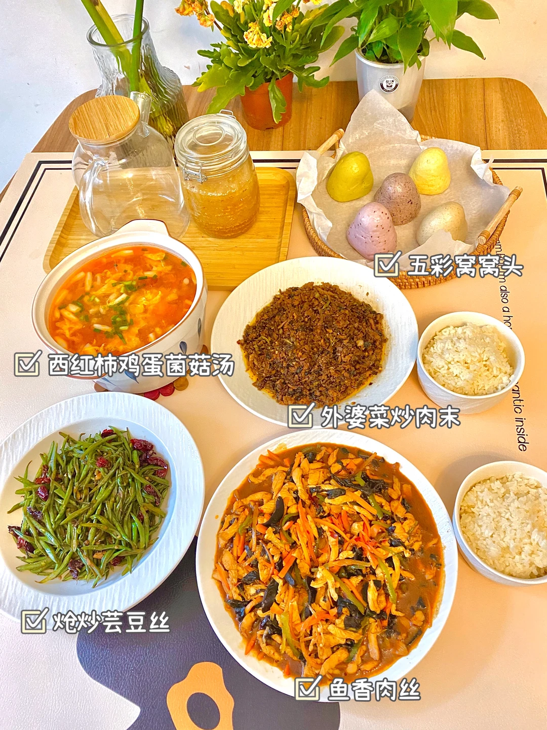 五彩窝窝头、西红柿鸡蛋菌菇汤