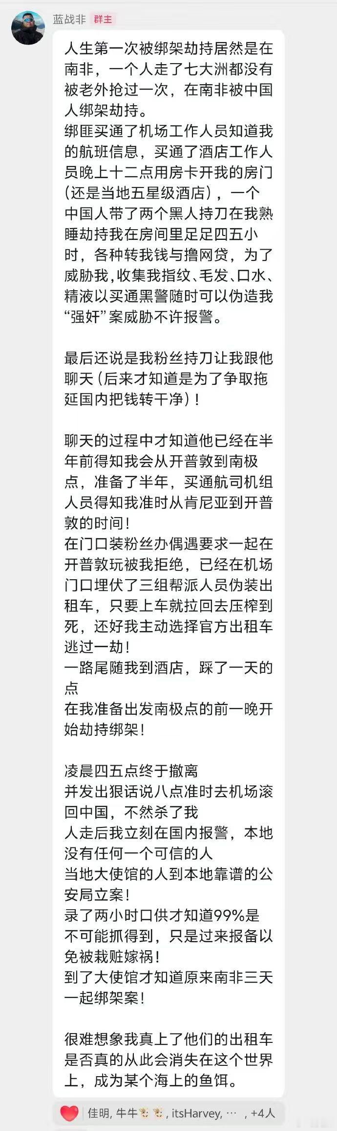 蓝战非在粉丝群里讲他在南非被绑架的经过