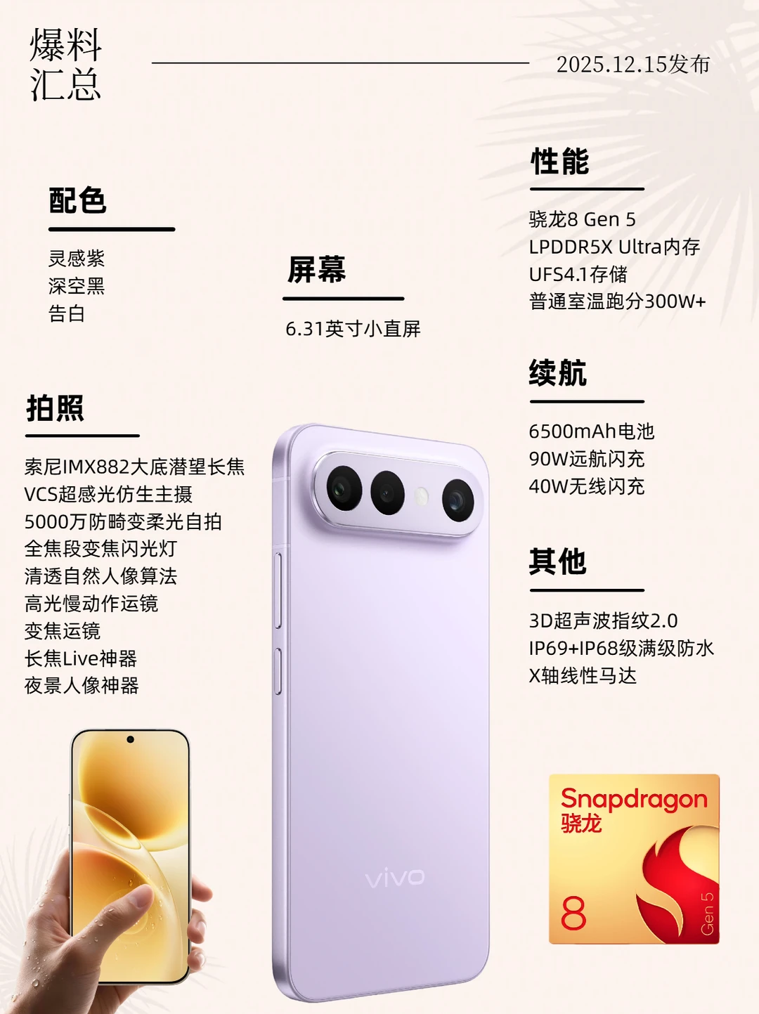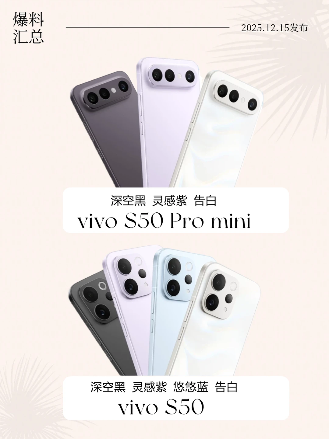 高颜值手机vivo S50系列,12月15日就要发布啦 目前外观、性能、影像、续航、外围等方面的爆料已经很多了 今天我就给大家汇总一波,看看值不值得你入手 [星R]先说颜值&手感 现在已经放出了【告白】配色的官图,好看的手机+1 整体给人一种阳光照耀在冬日初雪上的感觉 ps.深空黑、悠悠蓝(只有标准版有)、灵感紫也好看 细节方面更是诚意十足 浮空岛镜组、圆润R角、金属中框、纱缎光刻工艺……都有 真的是既有高颜值又有好手感 [星R]然后是性能 S50 Pro mini真的很顶 处理器是25年新出的旗舰芯——骁龙8 Gen 5 搭配LPDDR5X Ultra+UFS4.1的存储组合 真·性能铁三角,普通室温跑分300W+ 日常使用体验直接拉满 [星R]其次是拍照 硬件配置很旗舰,索尼IMX882潜望长焦、大底主摄、全焦段变焦闪光灯都安排上了 软件算法也很顶,旗舰同款清透自然人像算法+「高光慢动作运镜」+「变焦运镜」两种live图运镜玩法 官方说了,vivo S50系列是长焦Live神器+夜景人像神器 [星R]再次是续航 电池容量6500mAh 充电有90W有线+40W无线充 续航焦虑患者狂喜 [星R]蕞后是外围 X300系列同款3D超声波指纹,录入识别更快、解锁率更高 IP69+IP68级满级防水,淋淋雨也不怕 X轴马达,玩大型手游会很有沉浸感 [派对R]总结:vivo S50系列是高颜值强性能长续航全能拍照手机,值得入手,感兴趣的可以准备好荷包冲