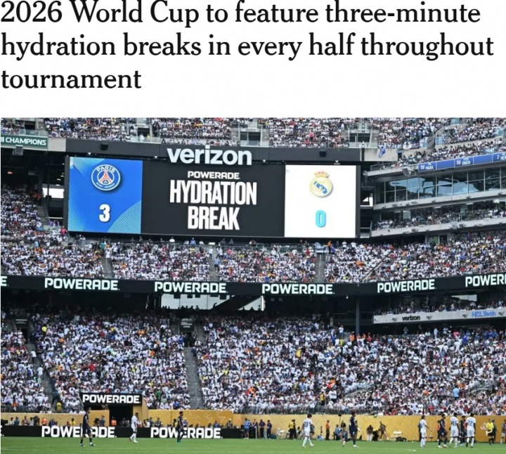 直播吧12月09日讯国际足联此前正式宣布,2026美加墨世界杯将实施新规:无论天气条件如何,比赛上、下半场第22分钟各有一次时长三分钟的强制补水时间,这也是世界杯历史首次。