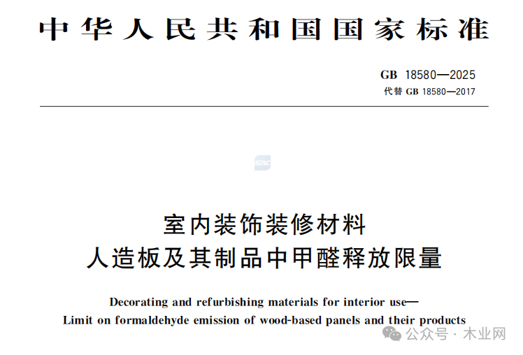 市场监管总局近日发布人造板新国标GB 18580-2025《室内装饰装修材料 人造板及其制品中甲醛释放限量》,将于2026年6月1日实施,取代GB 18580-2017标准。新标首次明确将E0、E1级标准纳入法规要求,并细化了人造板分类及检测方法,甲醛限量指标全面趋严。