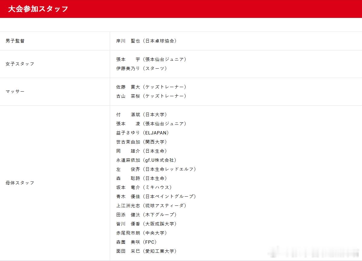 wtt年终总决赛25张本智和 日本队参赛球员和随行人员名单。琉球的上江洲光志,应该是张本智和请的陪练。