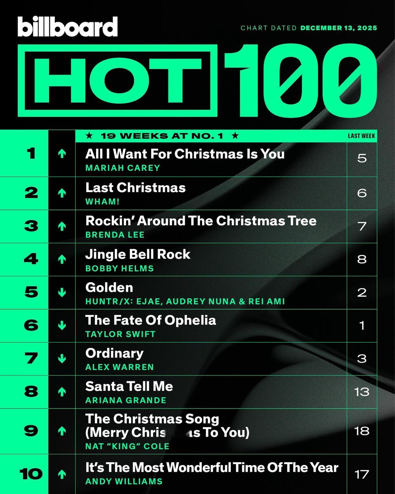 玛丽亚·凯莉(Mariah Carey)的经典圣诞单曲《All I Want for Christmas Is You》在本周(2025年12月14日)Billboard Hot 100榜单上重返No.1,累计登顶19周,与Lil Nas X的《Old Town Road》和Shaboozey的《A Bar Song (Tipsy)》并列历史最长纪录。这首1994年发行的歌曲自2019年起每年圣诞季强势回归,若下周(12月21日)继续领跑,它将独占鳌头,成为首位达成20周的歌曲。玛丽亚·凯莉成为历史上第一位在公告牌百强单曲榜上连续98周位居榜首的艺人,她的歌曲《All I Want For Christmas Is You》连续第19周荣登榜首。预计她今年将连续100周位居榜首。