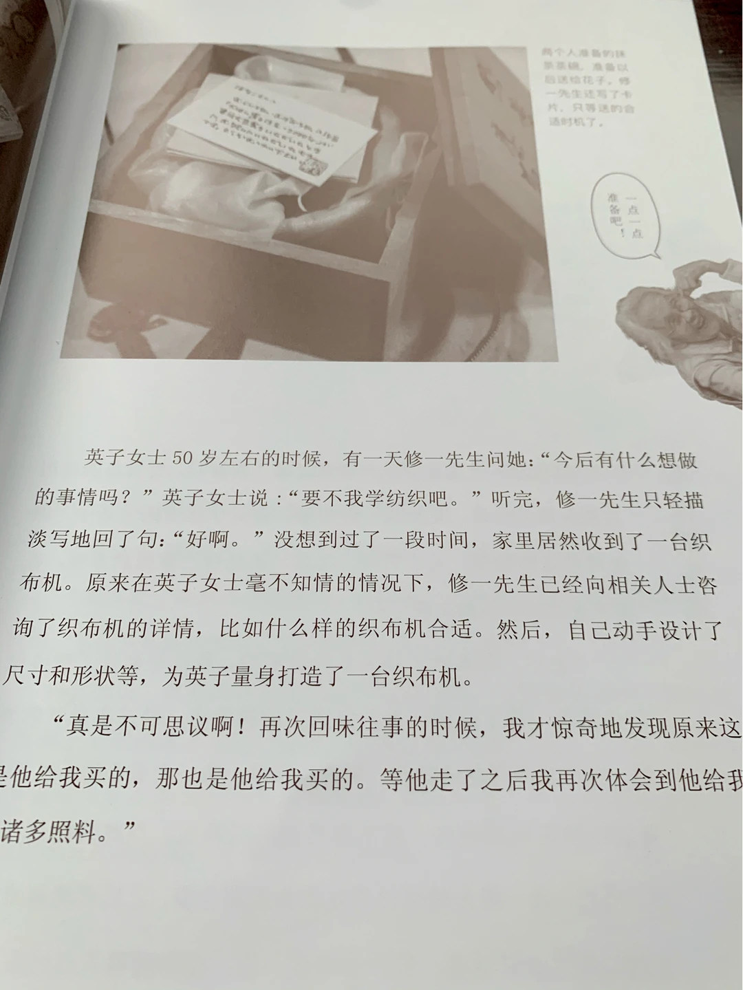 英子遇到不称心的事情,总会和修一商量,他会很耐心的告诉她两个人一起来想办法。凡是英子提及的事情,修一都会用心做到。他为英子动手做物件,甚至因为英子想学纺织而为她特别设计纺织机。英子即使在修一去世后依然感恩他的照顾,他的精神是她继续用心生活的力量。
