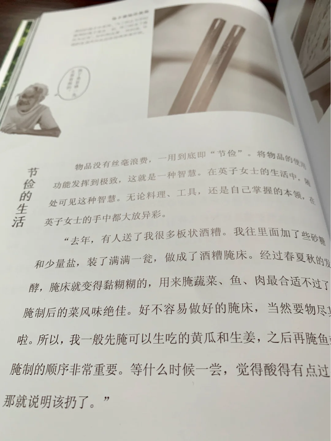 物品没有丝毫浪费,一用到底即“节俭”。将物品的使用功能发挥到极致,这就是一种智慧。在英子的生活中,随处可见这种智慧。用过的筷子作为菜筷,炸过一次的油等到下次炸时,老油和新油按照1:2的比例混合,修一穿过的衣服英子会继续穿。——
