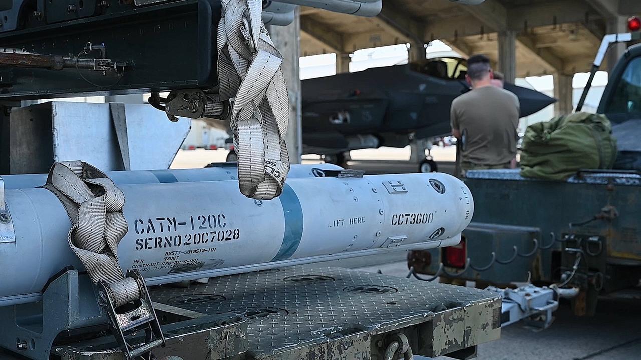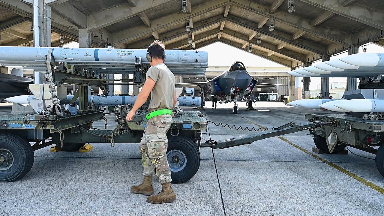 美国空军在日本嘉手纳空军基地的F-35A闪电II战斗机,正在装载内部弹舱AIM-