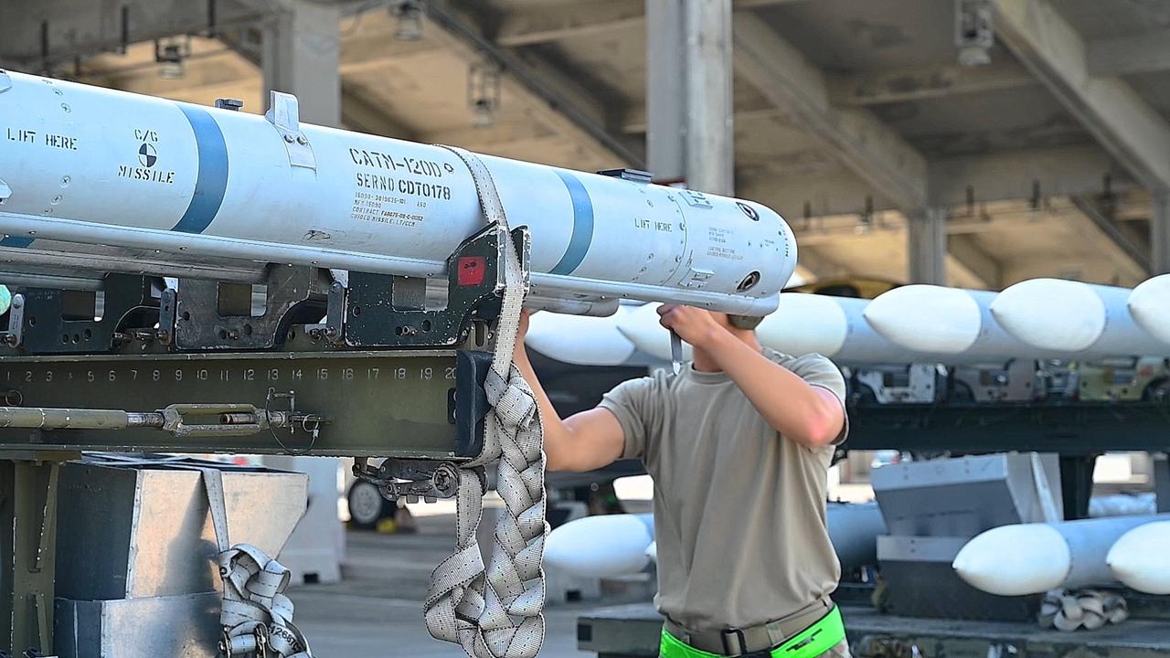 美国空军在日本嘉手纳空军基地的F-35A闪电II战斗机,正在装载内部弹舱AIM-120D空对空导弹。
