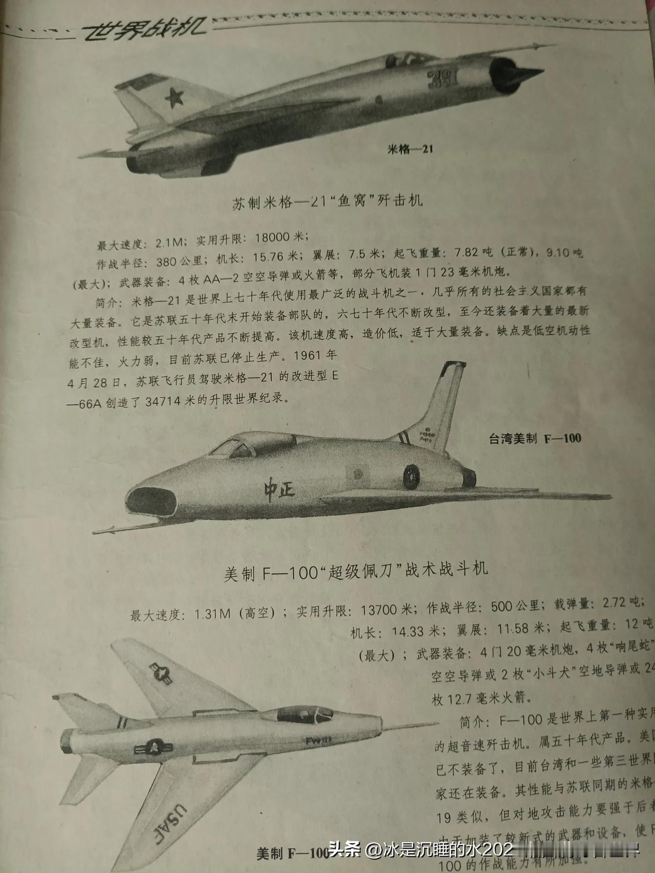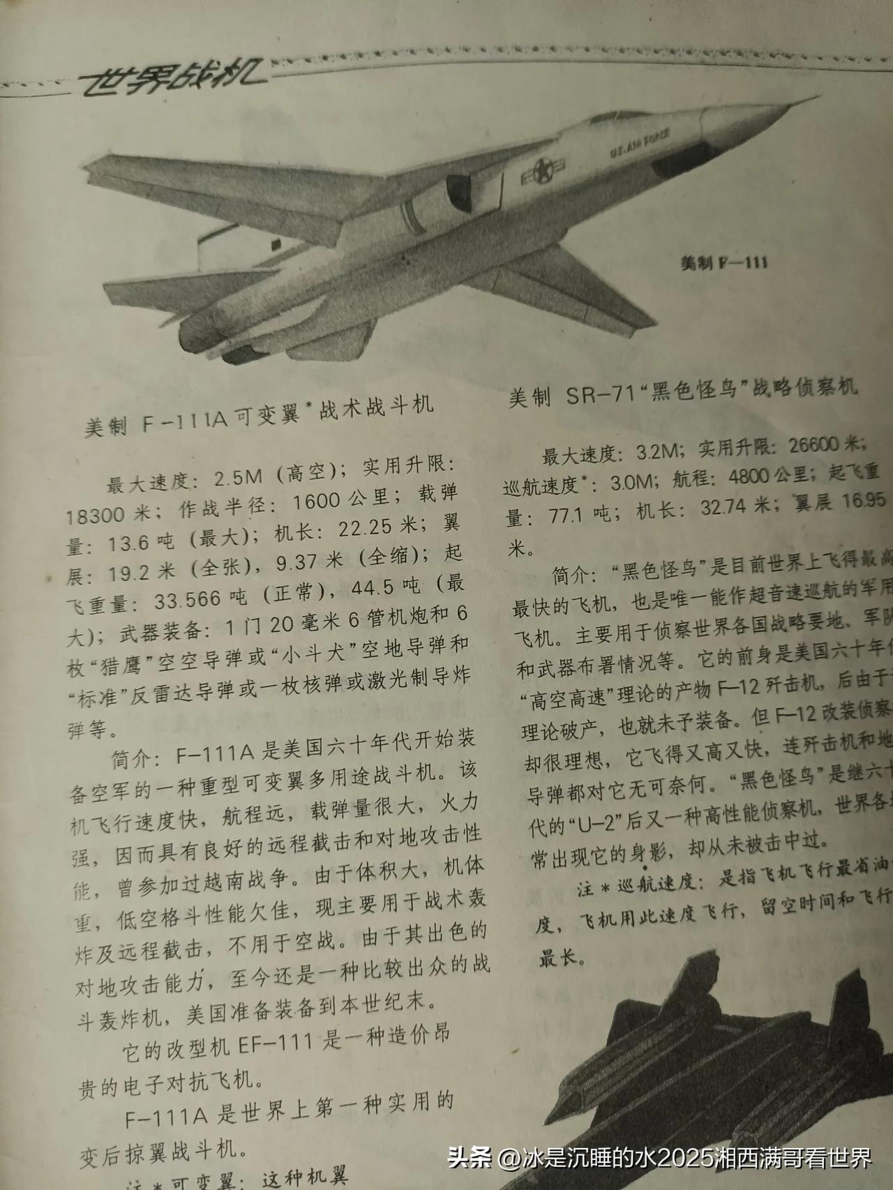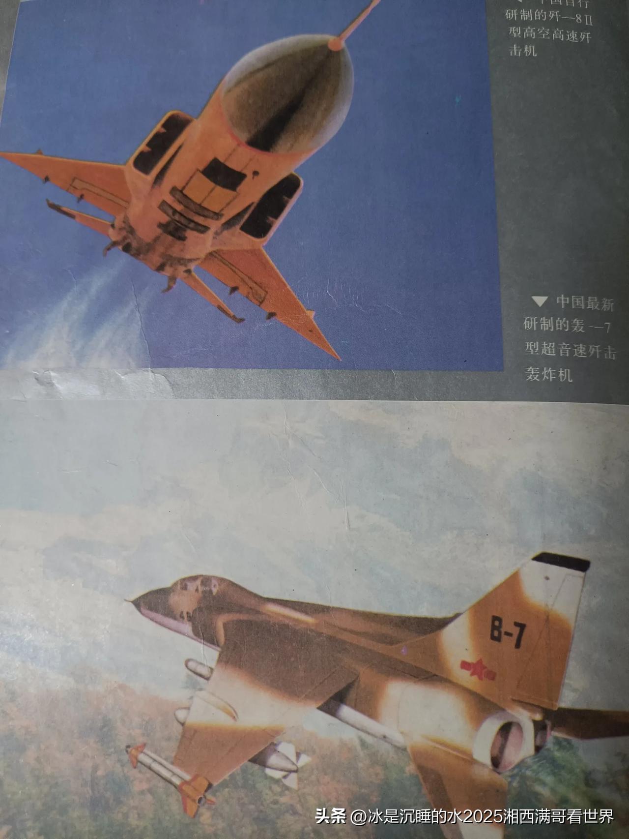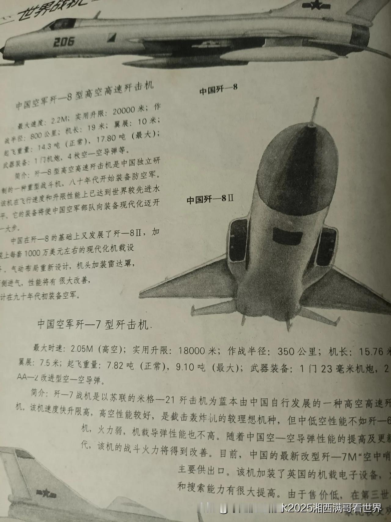 分享一组当年学生时代用节衣缩食的零花钱到书店买的《世界战机》零售价1.8元/本,汇集了中外各种喷气式战机,尤其是封二的歼-8II高空高速歼击机与轰-7歼击轰炸机是中国空军最先进的机型,更是心里的白月光、小甜甜。那个年代,中国空军主力战机还是机头进气的歼-6、歼-7,美国的B-2A已经问世,F-14、F-15、F-16、F-18如雷贯耳,苏联的苏-27、米格-29,法国的幻影2000,欧洲的狂风更是常年霸占各类军刊杂志封面。心酸、无助、羡慕嫉妒恨啊,现在的00后军迷是体会不到的。 各国战机