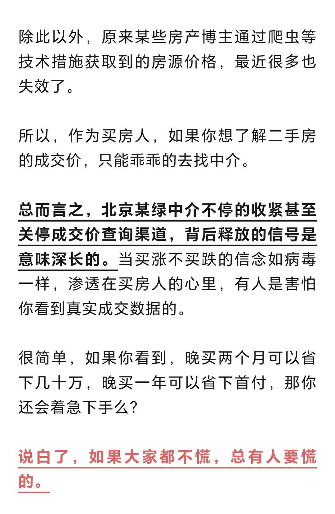 总而言之,北京某绿中介不停的收紧甚至关停成交价查询渠道,背后释放的信号是意味深长的。当买涨不买跌的信念如病毒一样,渗透在买房人的心里,有人是害怕你看到真实成交数据的。