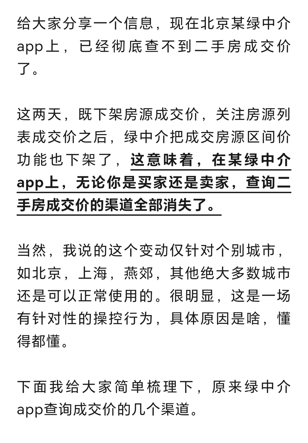 给大家分享一个信息,现在北京某绿中介app上,已经彻底查不到二手房成交价了。