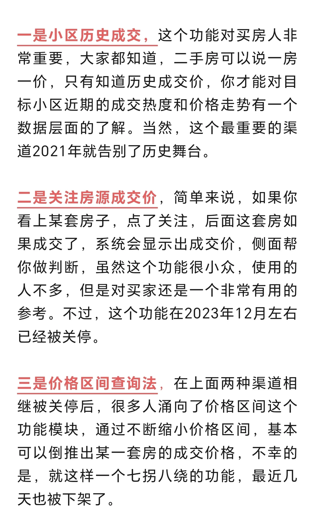 二是关注房源成交价,简单来说,如果你看上某套房子,点了关注,后面这套房如果成交了,系统会显示出成交价,侧面帮你做判断,虽然这个功能很小众,使用的人不多,但是对买家还是一个非常有用的参考。不过,这个功能在2023年12月左右已经被关停。