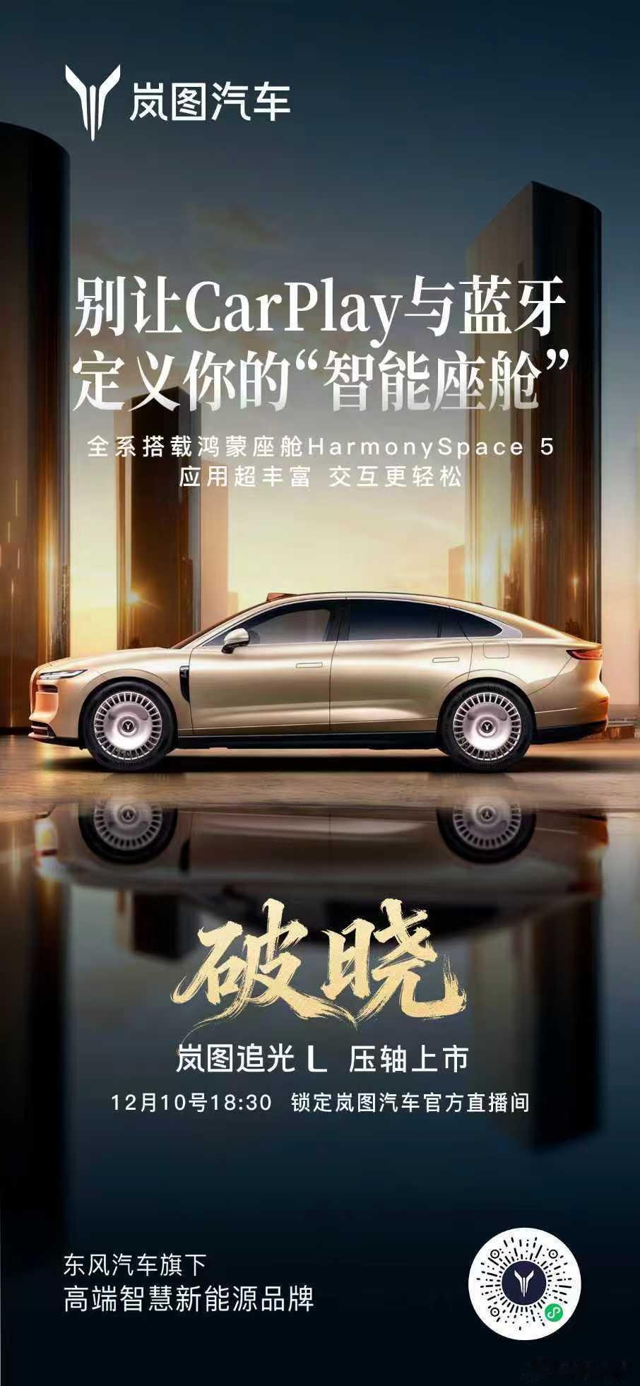 破晓之际 逐光而至当“豪华”依旧沿用旧有标尺,岚图追光L则把「舒展」「从容」「懂你」注入每一寸设计:空间,是不拥挤的松弛;座舱,是随手可得的智能;旅途,是不慌不忙的掌控。TA不靠标签定义奢享,只把“舒服”刻进每一程的体验。追光的人,终会与光同频。而这束关于“突破”的光,要你亲眼看见。今晚18:30,岚图追光L上市发布会「破晓」而来,让豪华回归身心舒展的本来模样。现在预约直播,还有超多惊喜好礼等你接住。12月10日岚图追光L压轴上市 人生高光开追光 华系首款800V插混旗舰轿车 追光L代表华系替代BBA
