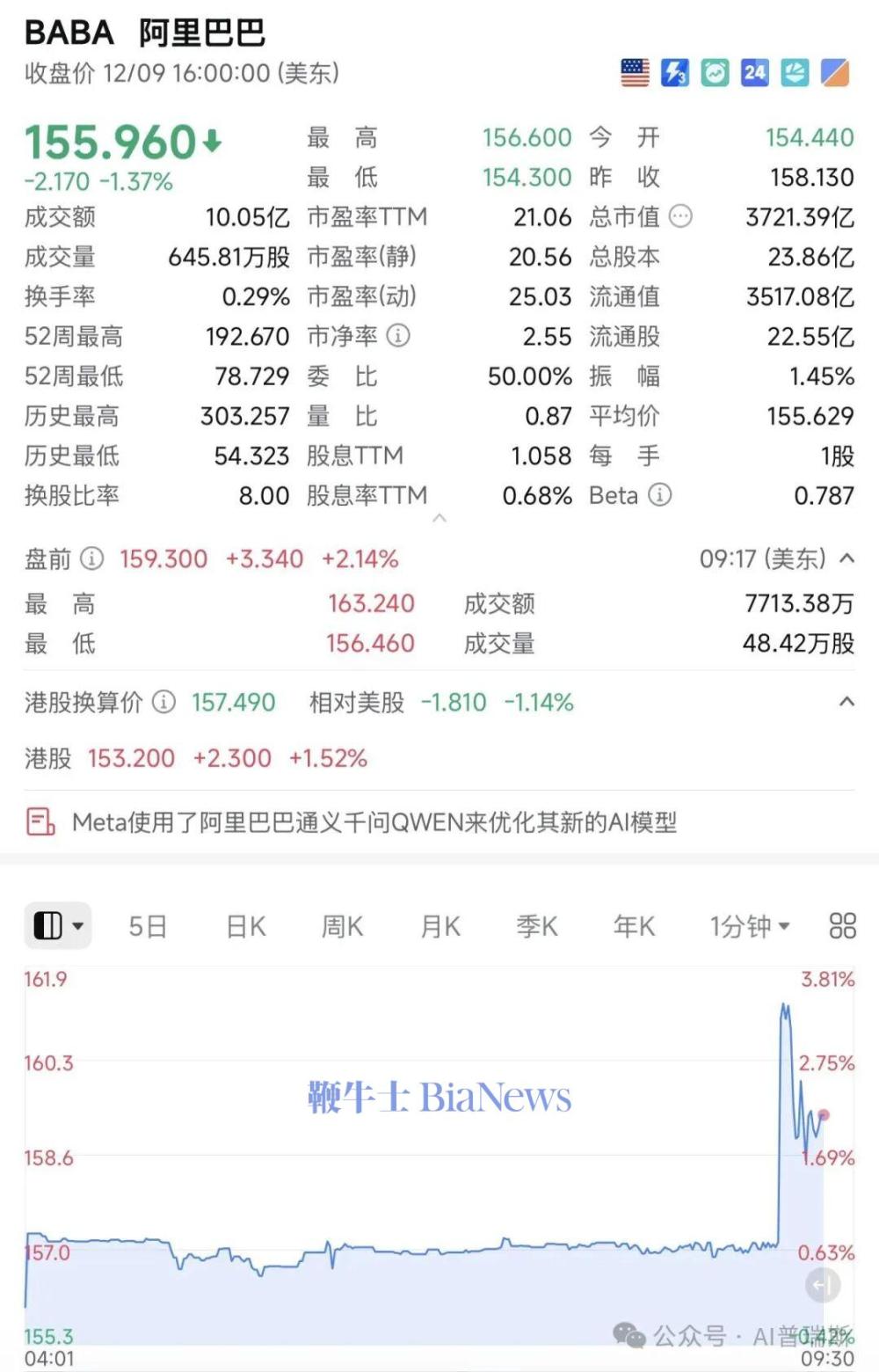 阿里股价盘前拉升2%。(转载自:AI普瑞斯)