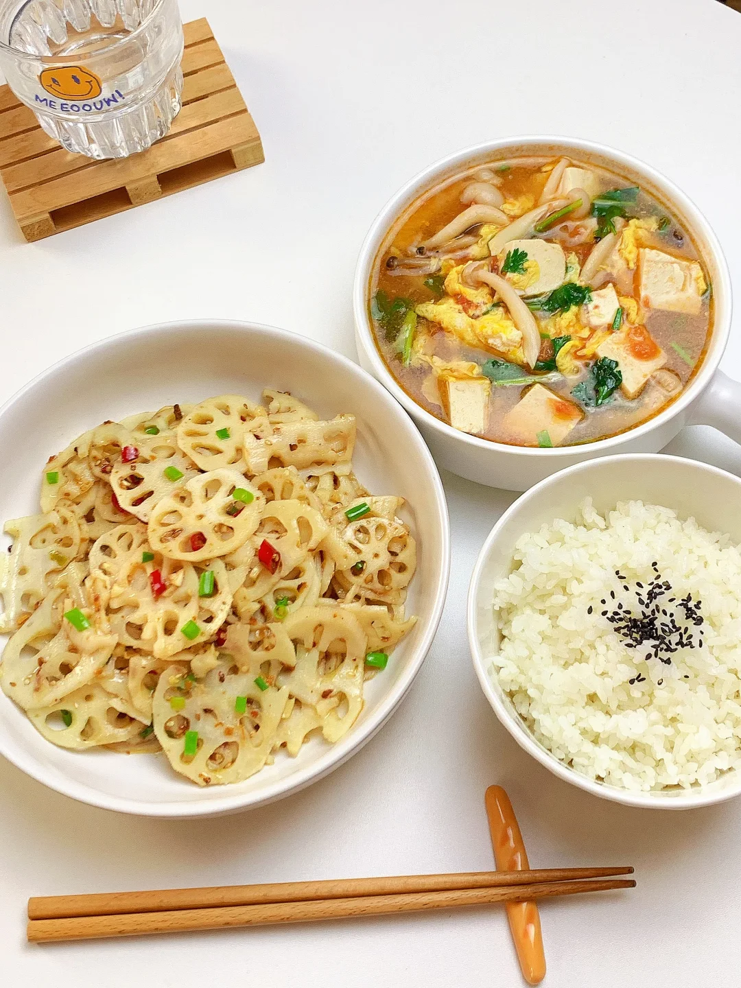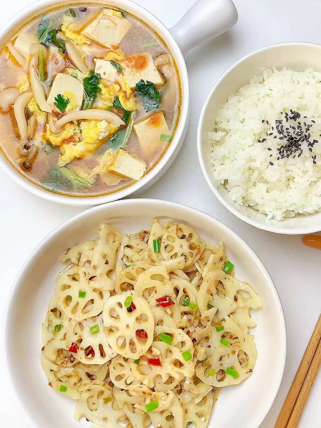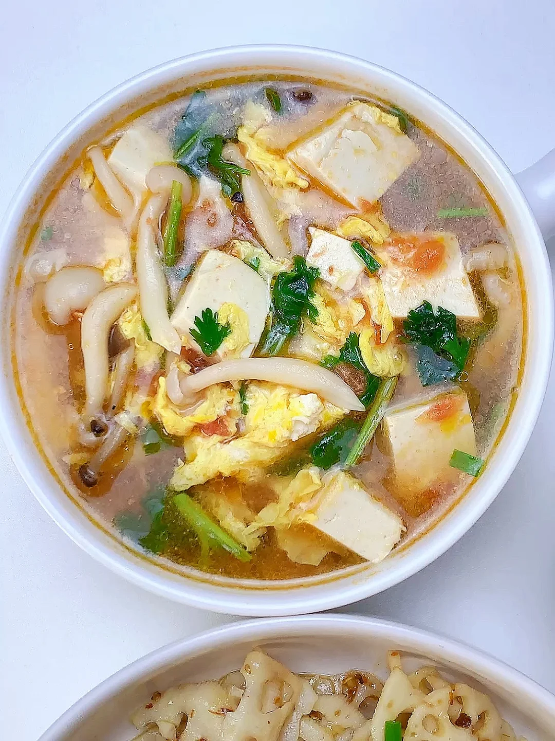 👩🏻🍳今日菜单分享 1️⃣菌菇豆腐鸡蛋汤 2️⃣酸辣藕片 主食:米饭🍚 ……………………………………………………………………………… 🛒食材清单:蟹味菇 | 白玉菇 | 鸡蛋 | 嫩豆腐 | 莲藕 📝早八打工人的一日三餐,拒绝外卖[偷笑R],坚持做饭的一天,吃简单干净的饭菜~ ♨️拌菜汁:葱花,蒜末,小米辣,白芝麻,辣椒粉,泼热油,1勺生抽,1勺蚝油,2勺香醋,半勺白糖,少许盐 ₍˄·͈༝·͈˄*₎◞ ̑̑