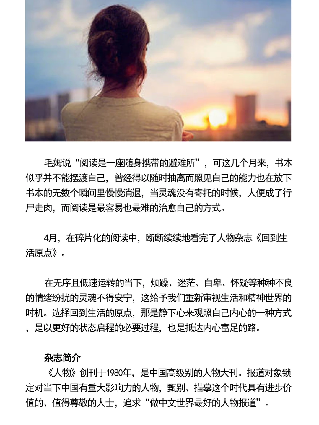 在无序且低速运转的当下,烦躁、迷茫、自卑、怀疑等种种不良的情绪纷扰的灵魂不得安宁,这给予我们重新审视生活和精神世界的时机。选择回到生活的原点,那是静下心来观照自己内心的一种方式,是以更好的状态启程的必要过程,也是抵达内心富足的路。 这本书《回到生活原点》是《人物》杂志的又一力作。希望那个让你开始的理由,正是你要抵达的终点。