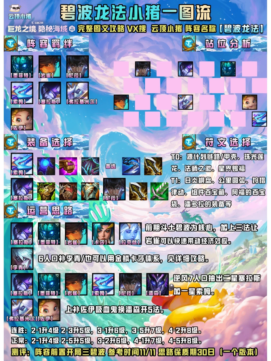 前期可以用卡莎为主,或者三法岩雀为主C来叠碧波层数,中期自然嫖牌上就可以了,可以输但是碧波龙层数不能落下。