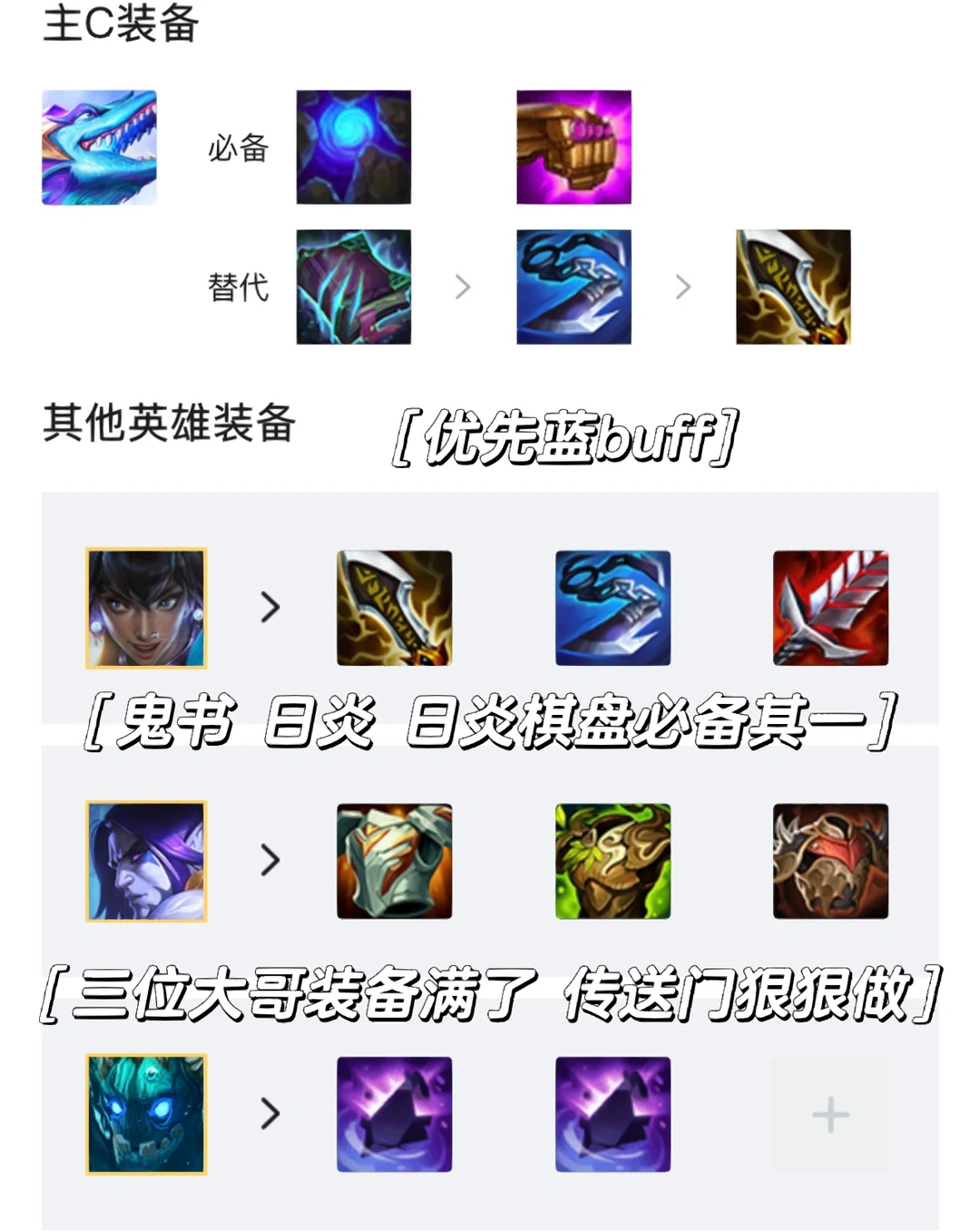 装备思路:索姆蓝BUFF是必做的,然后补两件输出,有日炎棋盘或者日炎就可以不要鬼书改暴力出装。尼菈至少两件套输出装,一般不给偷偷,尼菈挺关键的,其他多的优先传送门。