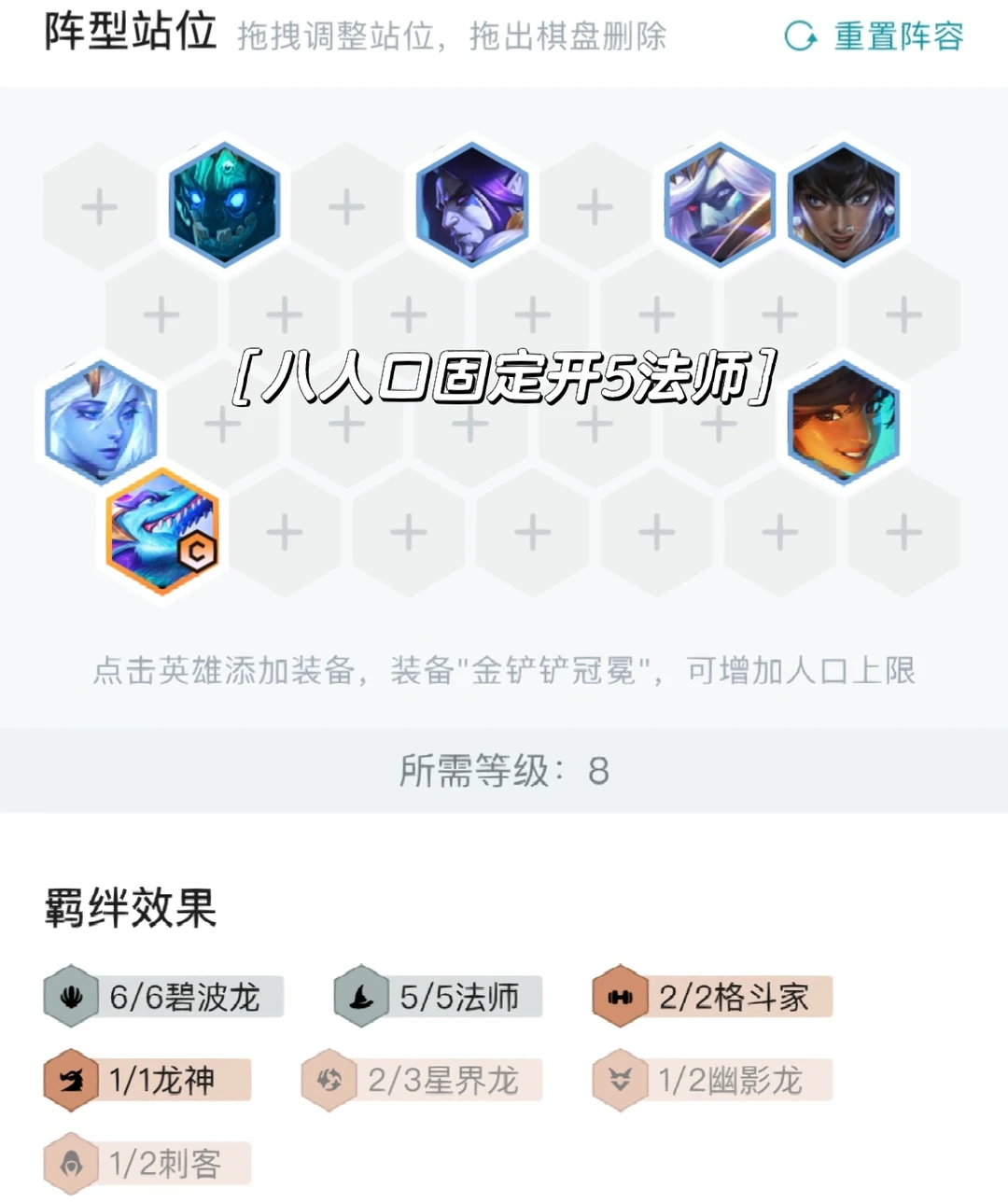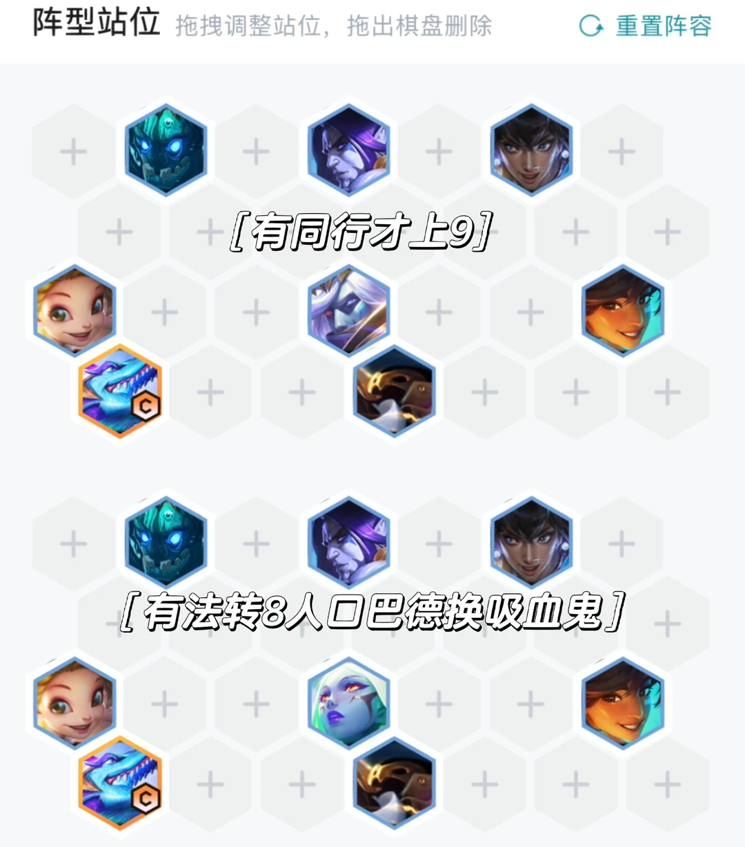 这个阵容基本上不需要上9,有法转8人口挂个巴德,很容易出二星佐伊基本就成型了,有同行的情况才考虑上9否则上9提升很小不如追三星紫卡。