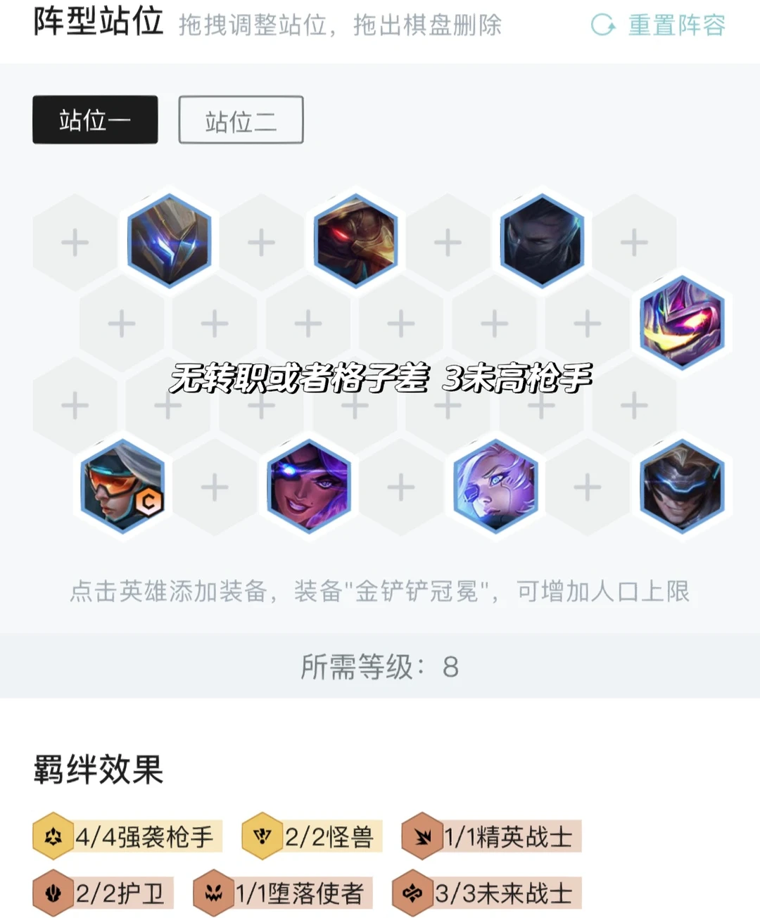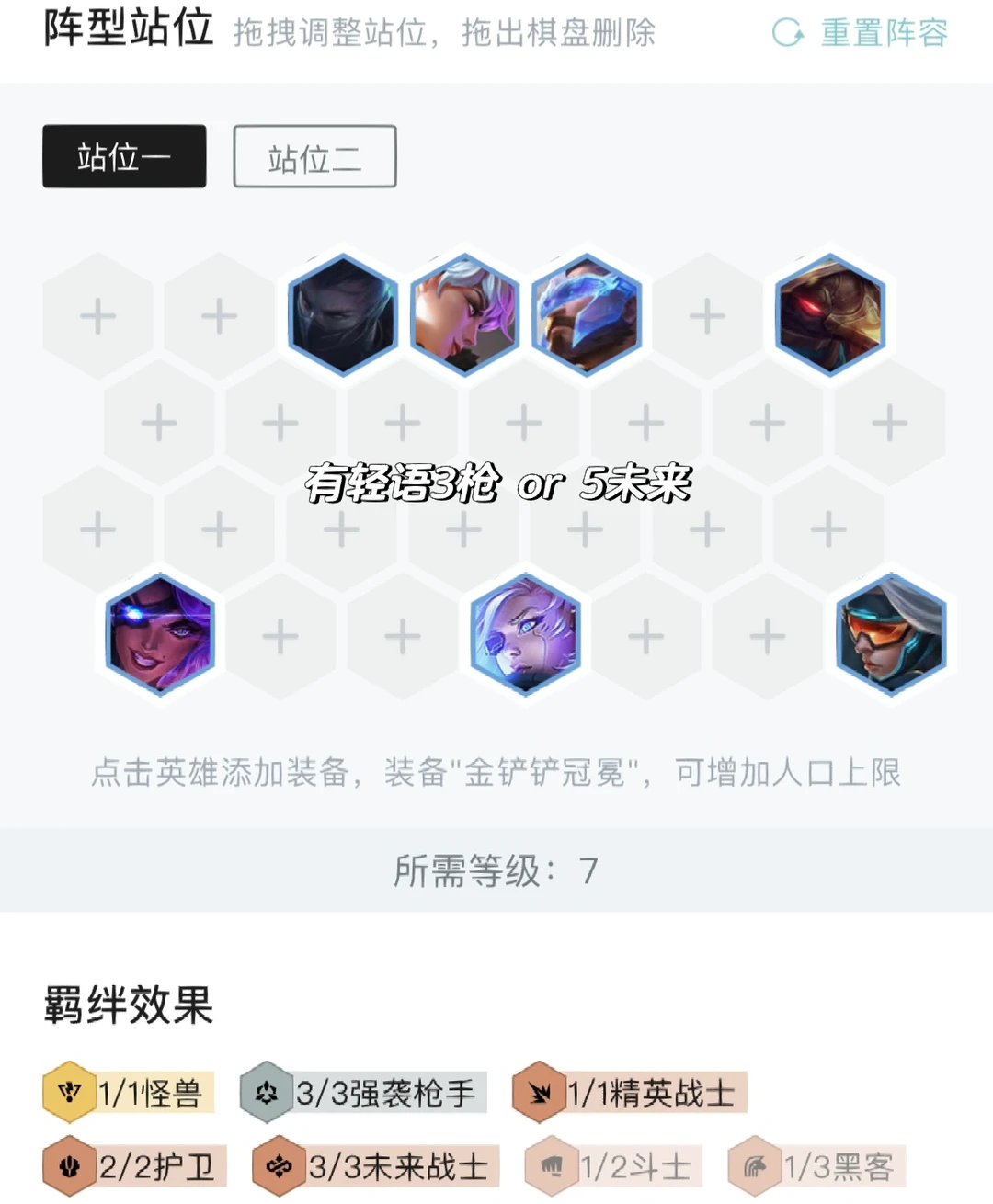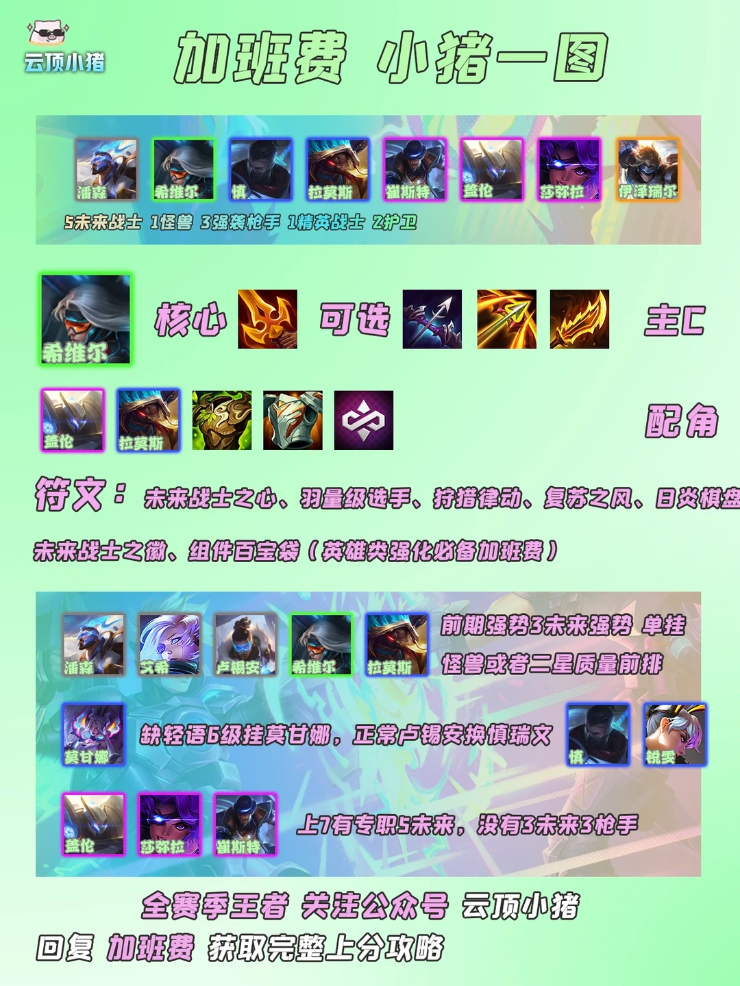 后期看能否有转职开7/5未来拼3枪手,前排外援首选盖伦/龙王/稻草人都是不错的。希维尔三星不了后期装备给莎弥拉别给EZ。