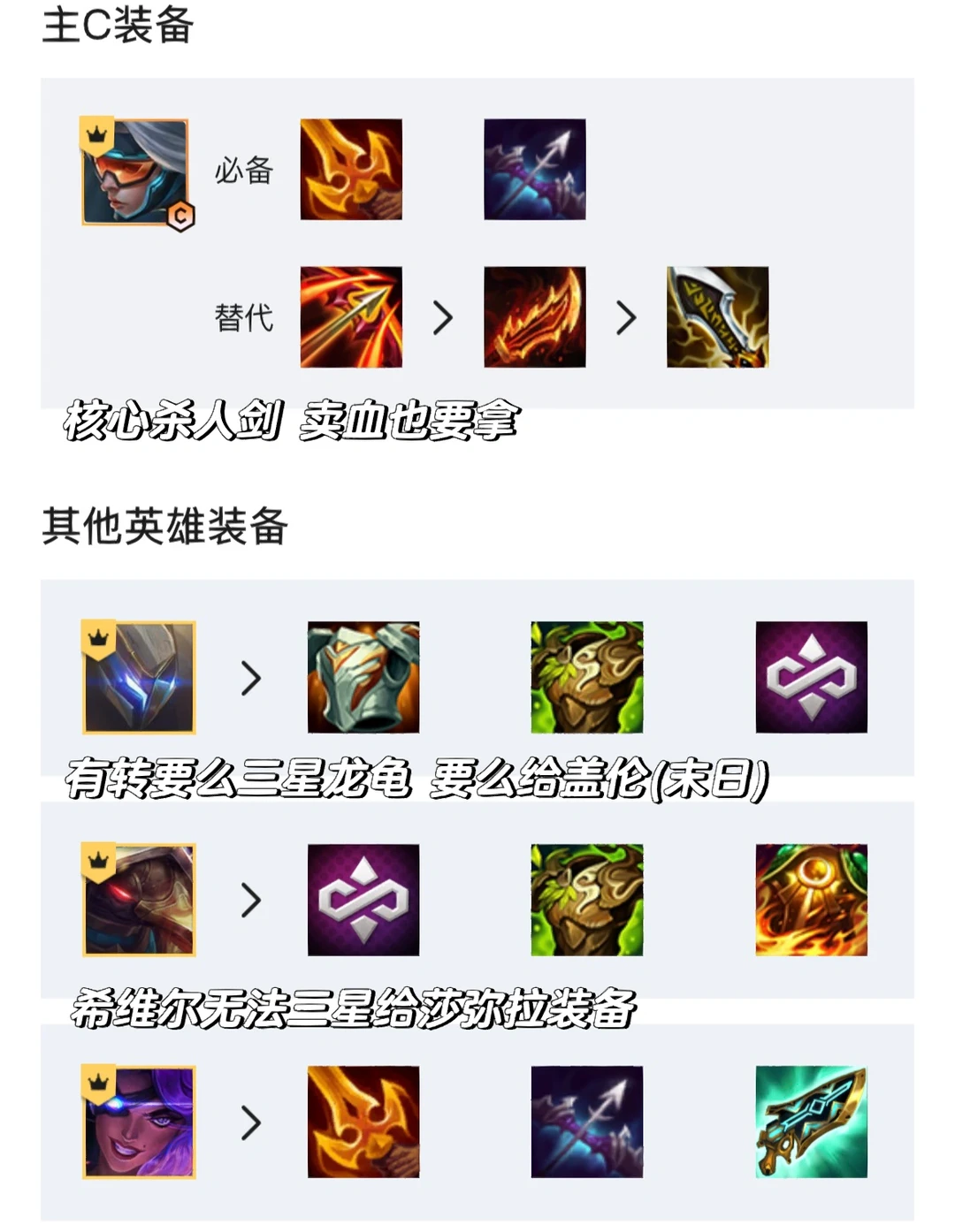 [氛围感R]装备思路:希维尔必做装备杀人剑,其他轻语优先级第二,第三件看情况补就行,肉装转职书给三星龙龟或者二星盖伦。