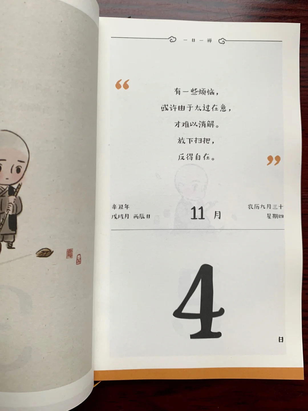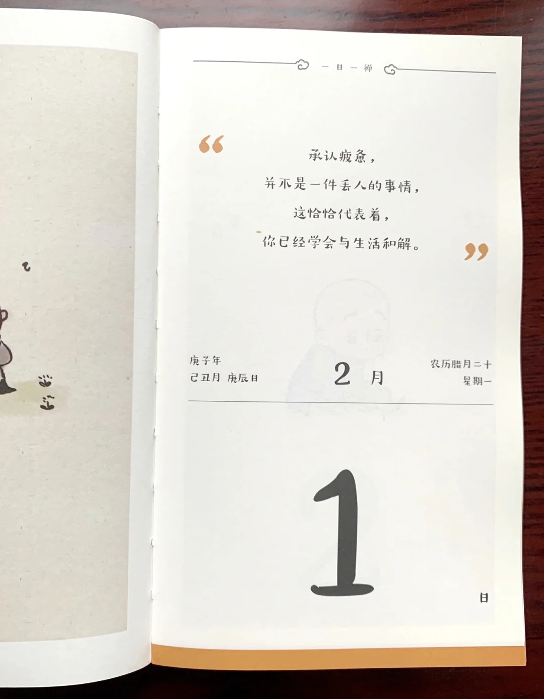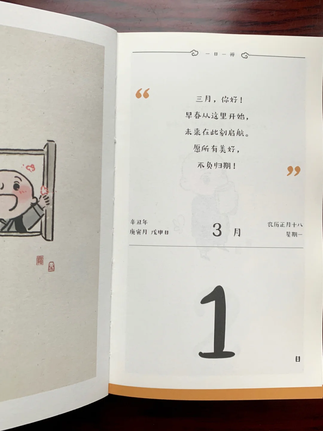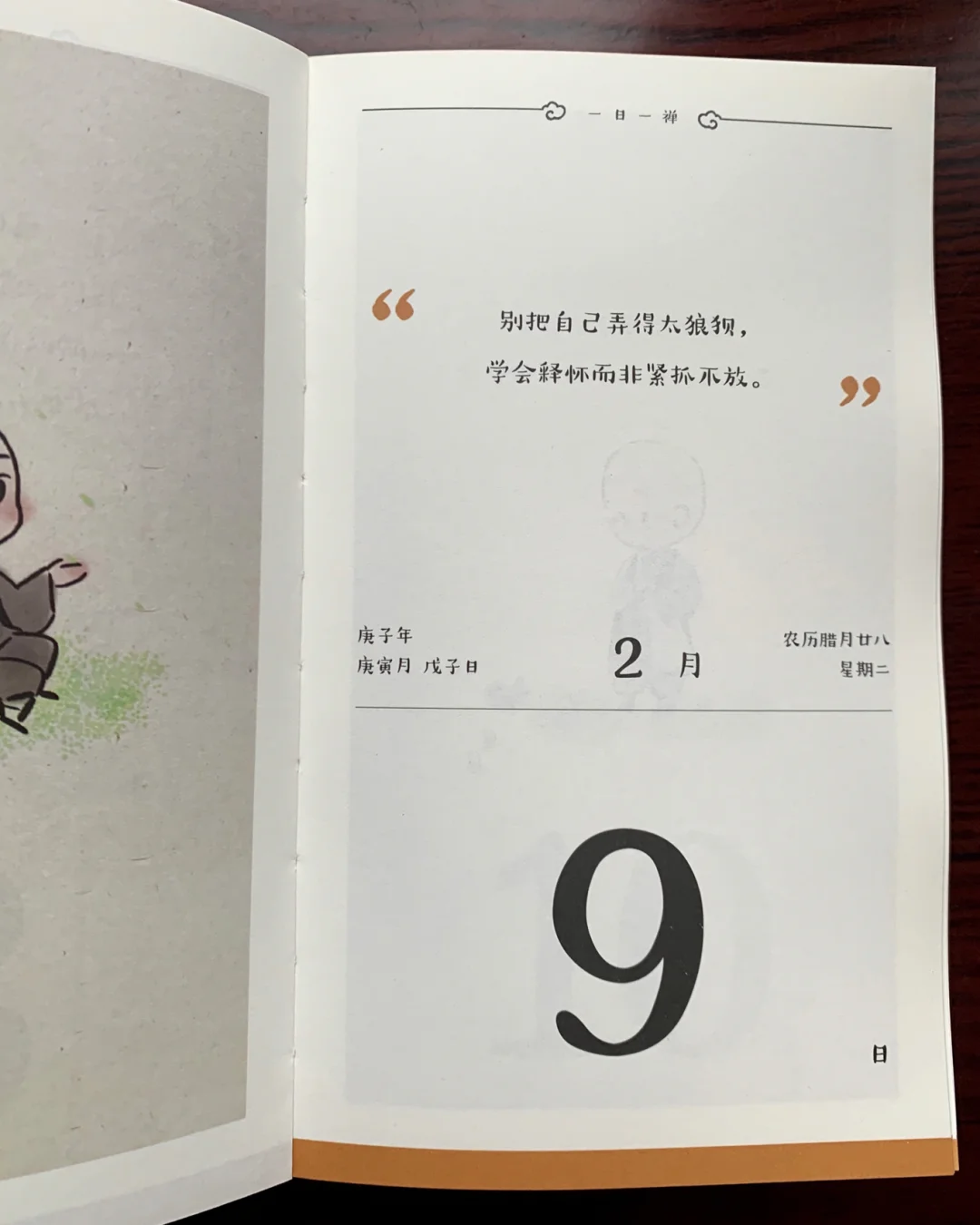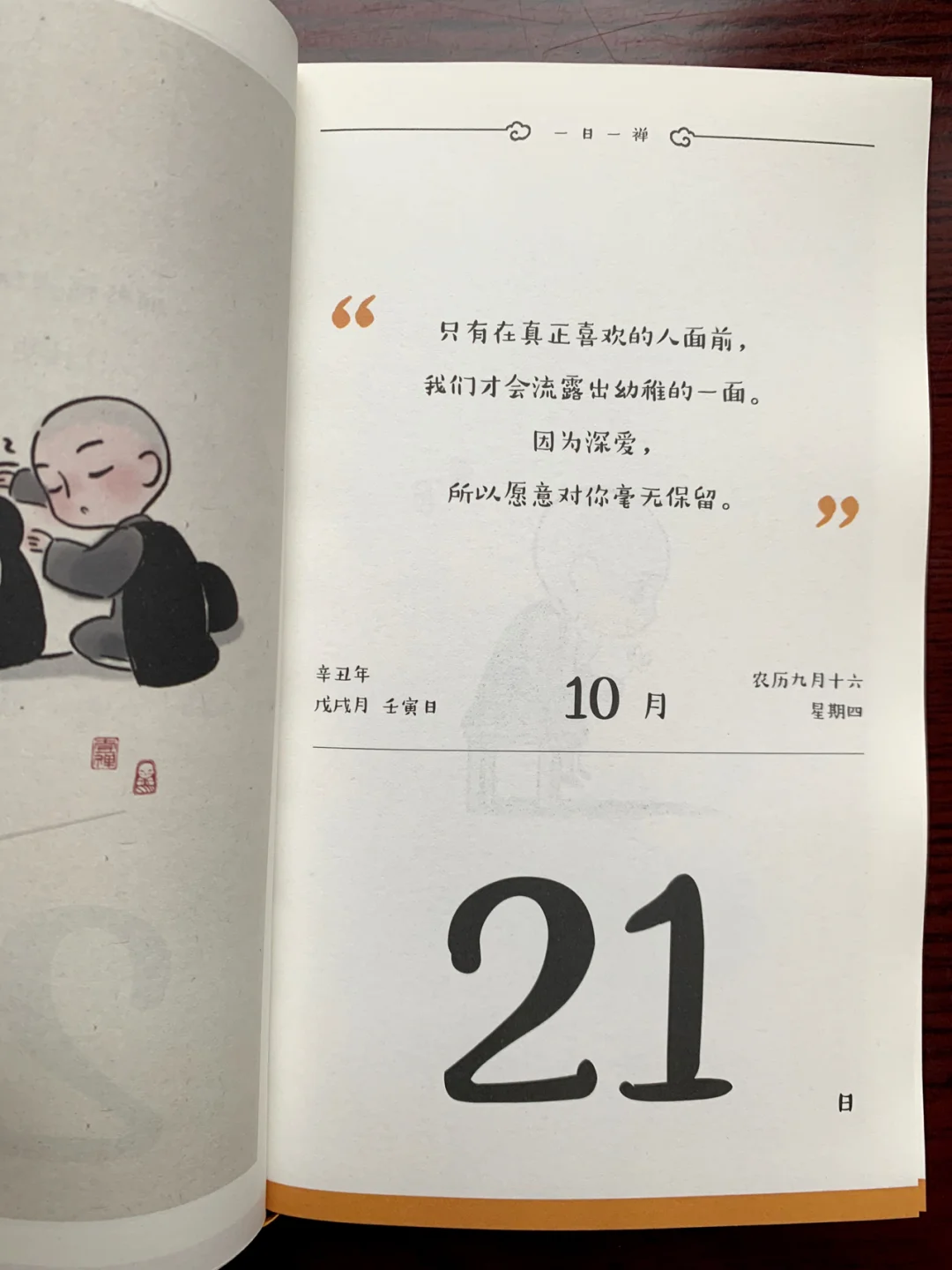 📃📅各种题材的精美日历数不胜数,能够打动人心的却很少。这本【一日一禅】一禅小和尚2021主题日历,生动有趣又富有哲理,它将时间与哲理结合,将漫画与哲理融合,既感人至深却没有营养的鸡汤,也没有深刻陈腐的大道理,只有朴素的生活哲理,你能在上面找到与生活、工作、爱情、选择等有关的禅语,每一天都能给予慰藉,如一碗阳春面,没有多少调料却能填饱肚子,吃饱后还能令人会心一笑。