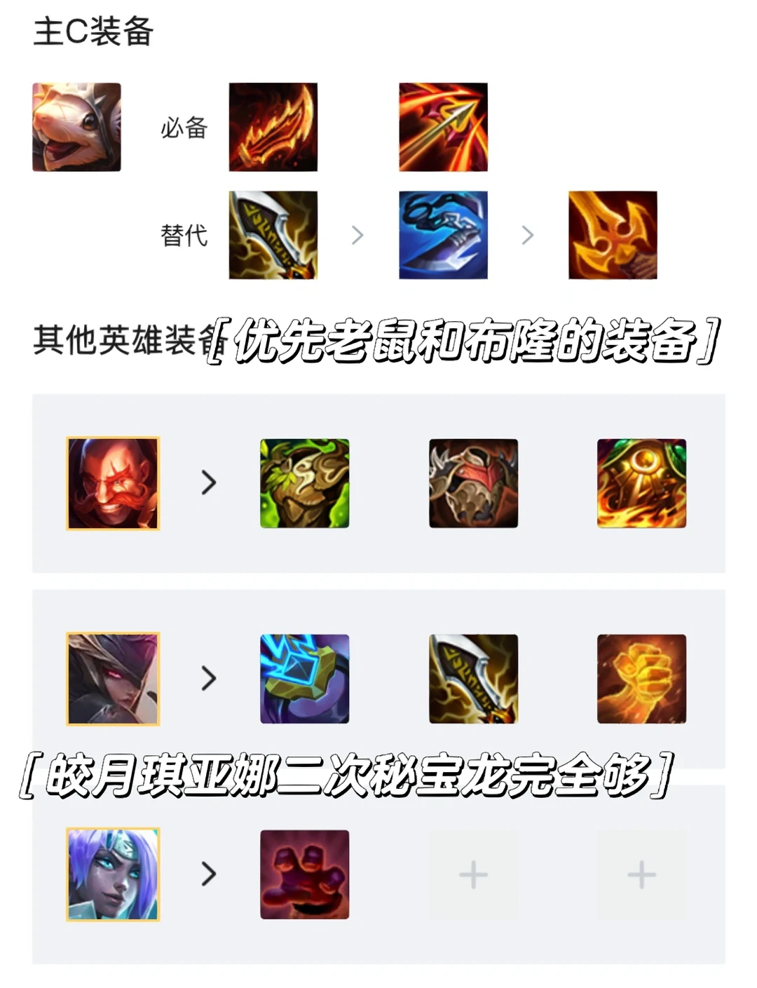[火R]装备思路:这个版本本来装备也比较多,我们这套阵容是多C分散输出,优先满足老鼠的神装和布隆的肉装,第二优先皎月或者奇亚娜三星后就给装备,像EZ和狗头能三星也可以给装备。