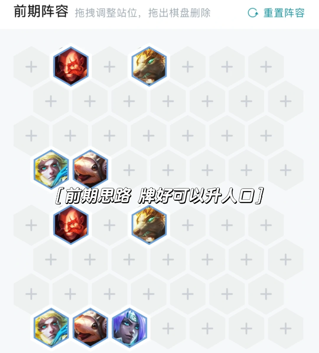 牌烂不拉人口,牌还不错2-1拉4,2-4拉5,3-2拉6,连胜可以抢节奏跳1-2个小回合抢人口。但是需要观察场上其他人的战力来定夺。