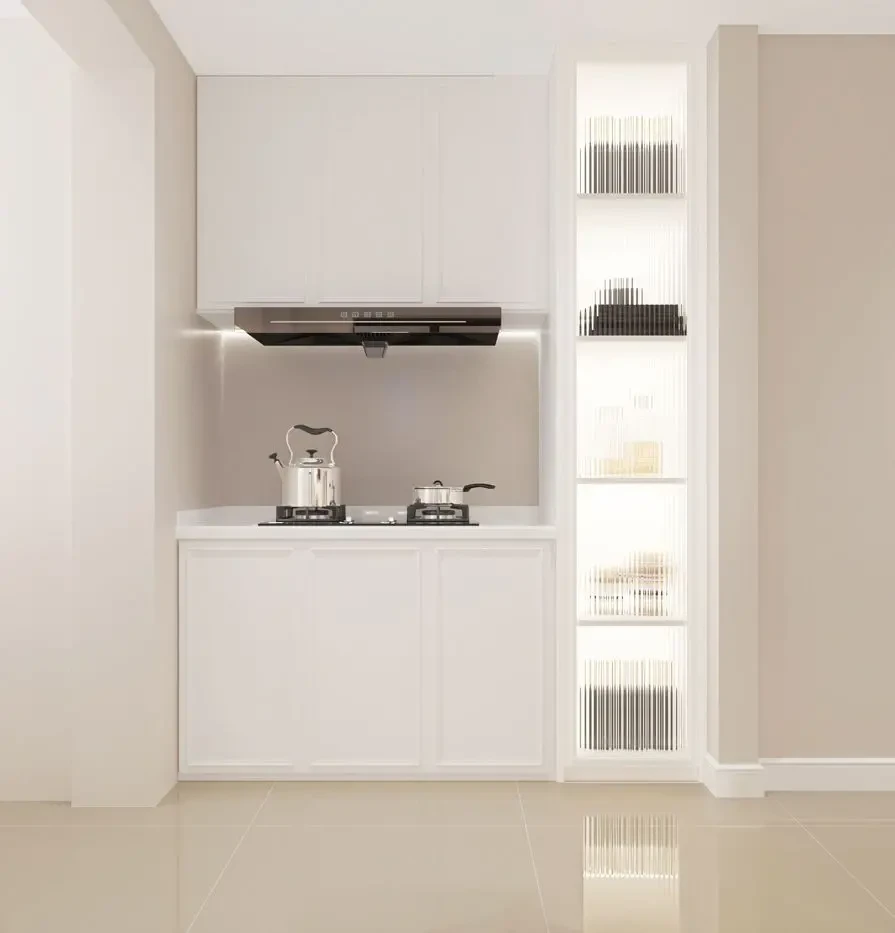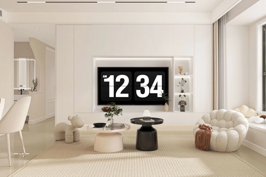 ☁空间整体运用低饱和度的配色,无主灯设计搭配着温馨线条落地灯,奶油色地砖简单干净。客厅背景以简洁为主,挂墙的装饰画,搭配米白色的柔软的云朵沙发,米色的地毯,电视背景墙多设计收纳柜。
