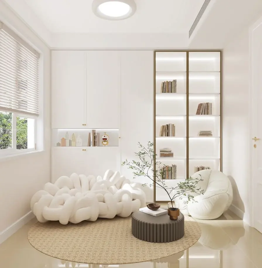 ☁编织小沙发柔软又可爱,圆形茶几绿植做点缀。定制通鼎收纳柜与玻璃门落地书柜很好的保证了收纳的需求,真是打发时间的好地方~