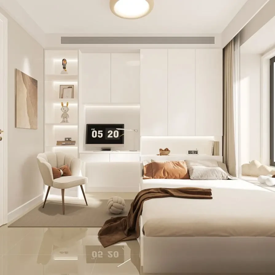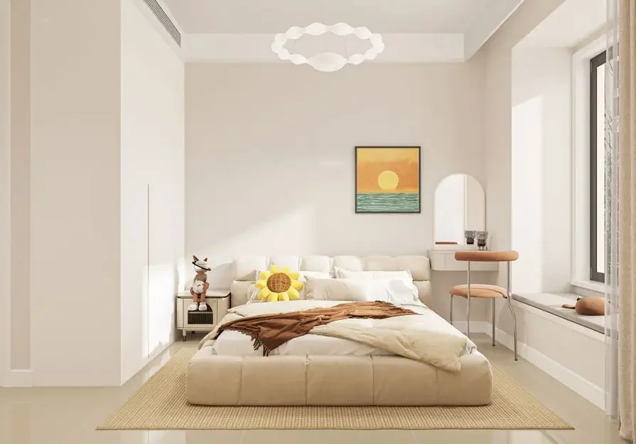 ☁卧室以奶油色为主色调,视觉上显得开阔又舒适。硬装与软装没有特别多的复杂设计,纯白色通顶衣柜满足了日常的收纳需求,主要是提高了卧室整体的舒适性和实用性。