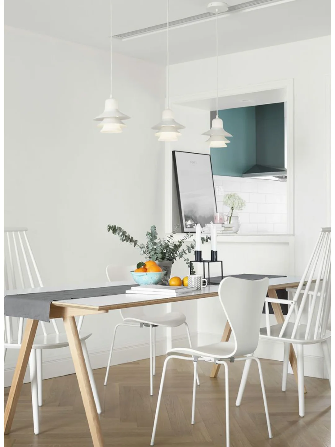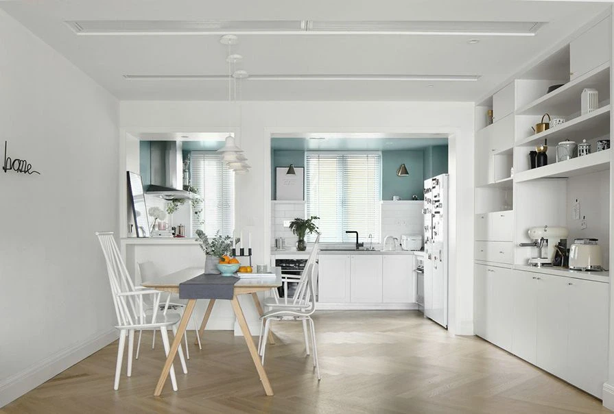 🌈餐厅整个空间也是极致的纯白与干净,实木餐桌+纯白餐椅,搭配上绿植的点缀做装饰,效果十分漂亮。