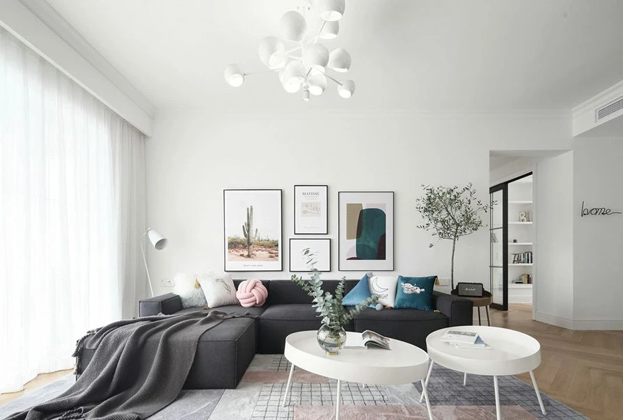 🌈整个空间非常注重采光,使用了大面积的纯色,来提升家居环境的亮度。原木色地板舒适又自然,没有做复杂的电视背景墙和沙发背景,只用几幅装饰画带过,显得很有艺术感。