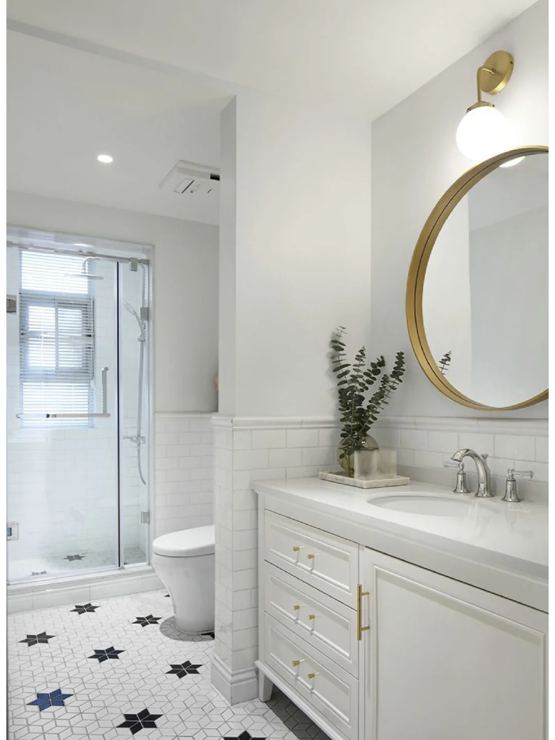 🌈三分离式卫生间的设计将干湿分离处理的更加理想的使用状态,能让居住的人使用的更便捷和舒适。纯白地砖上点缀了黑色六角星,美观又趣味,镜子周围金色的描边,低调奢华。