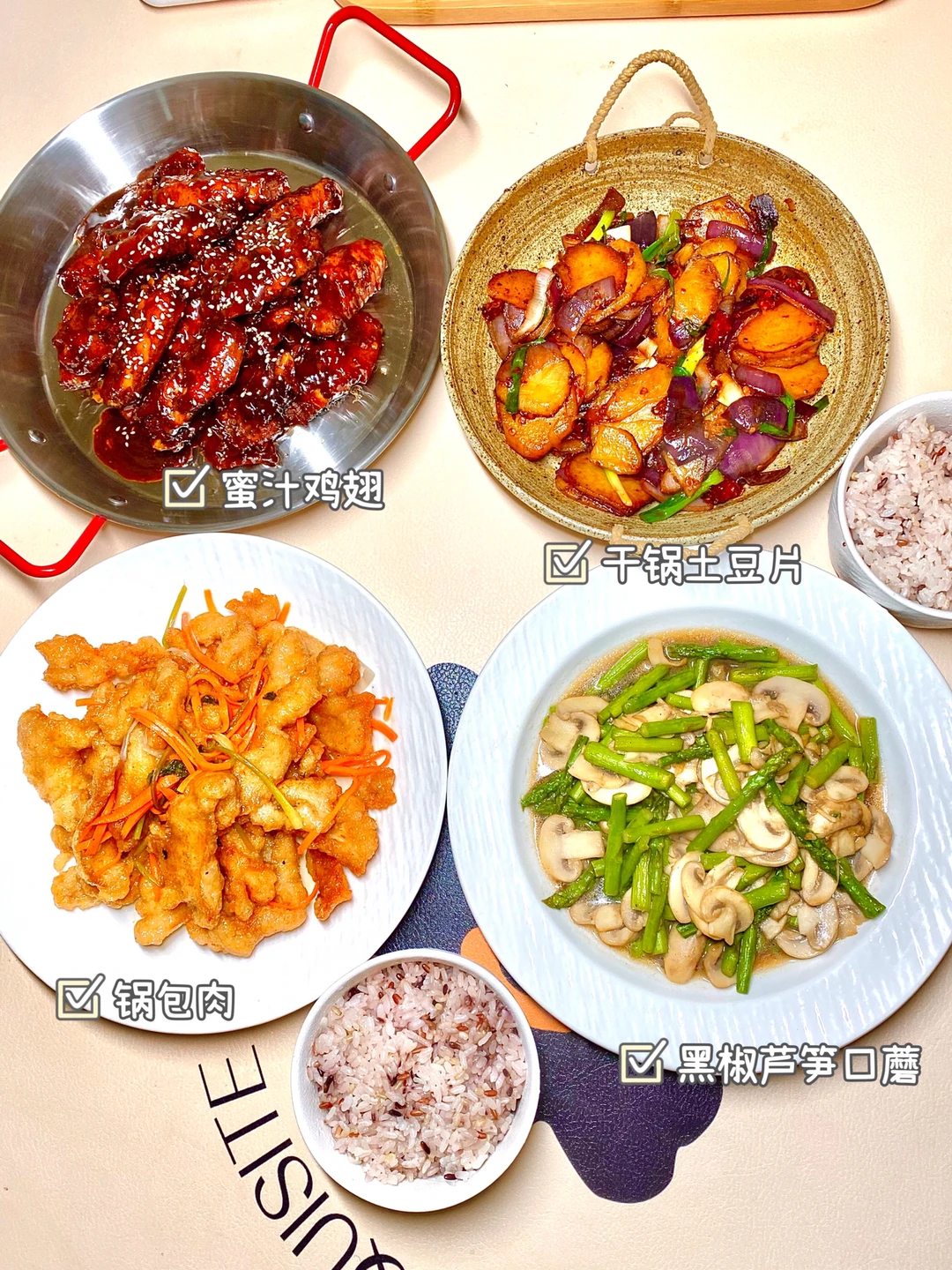 1⃣️蜜汁鸡翅、干锅土豆片