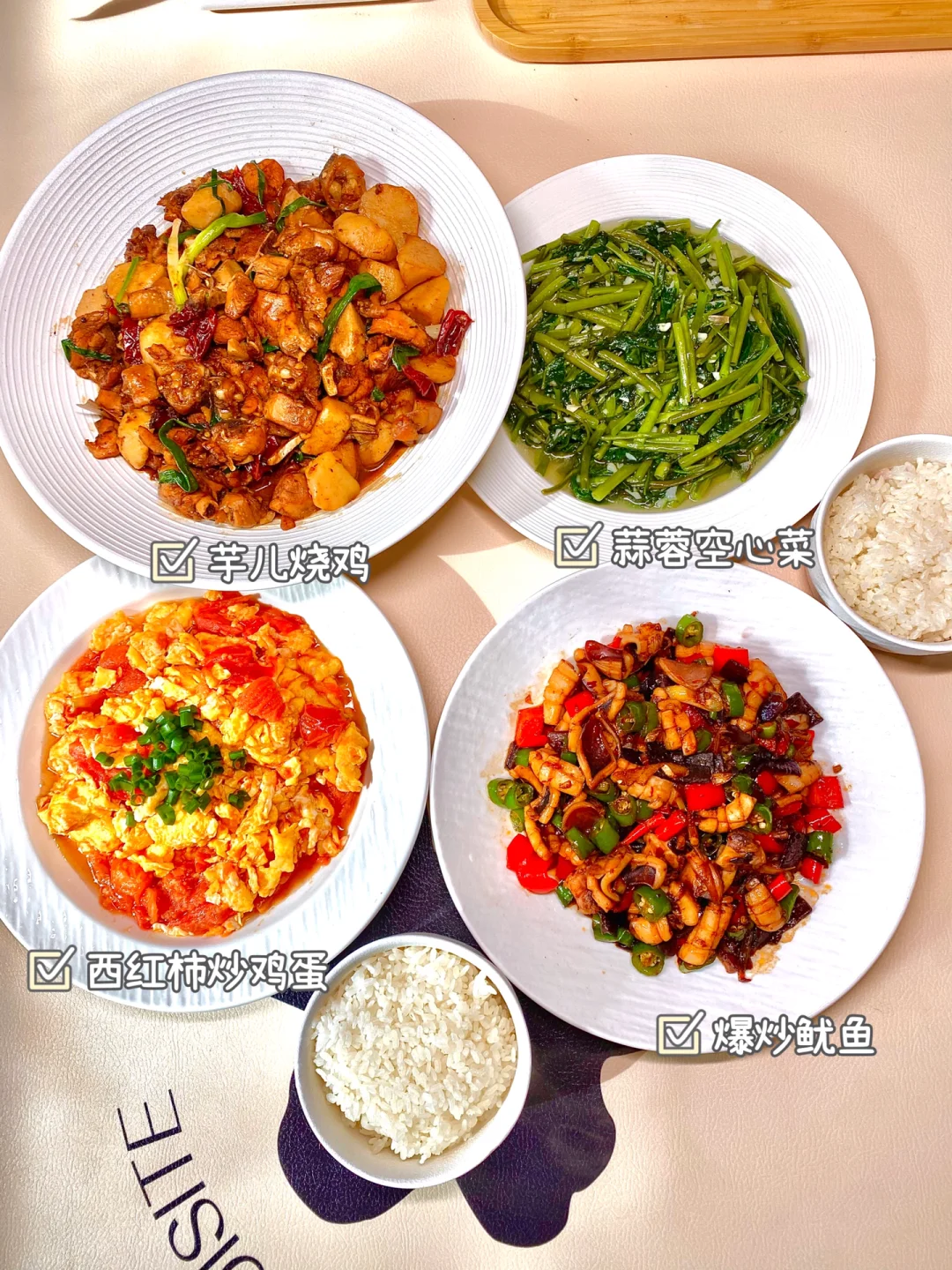 西红柿炒鸡蛋、爆炒鱿鱼