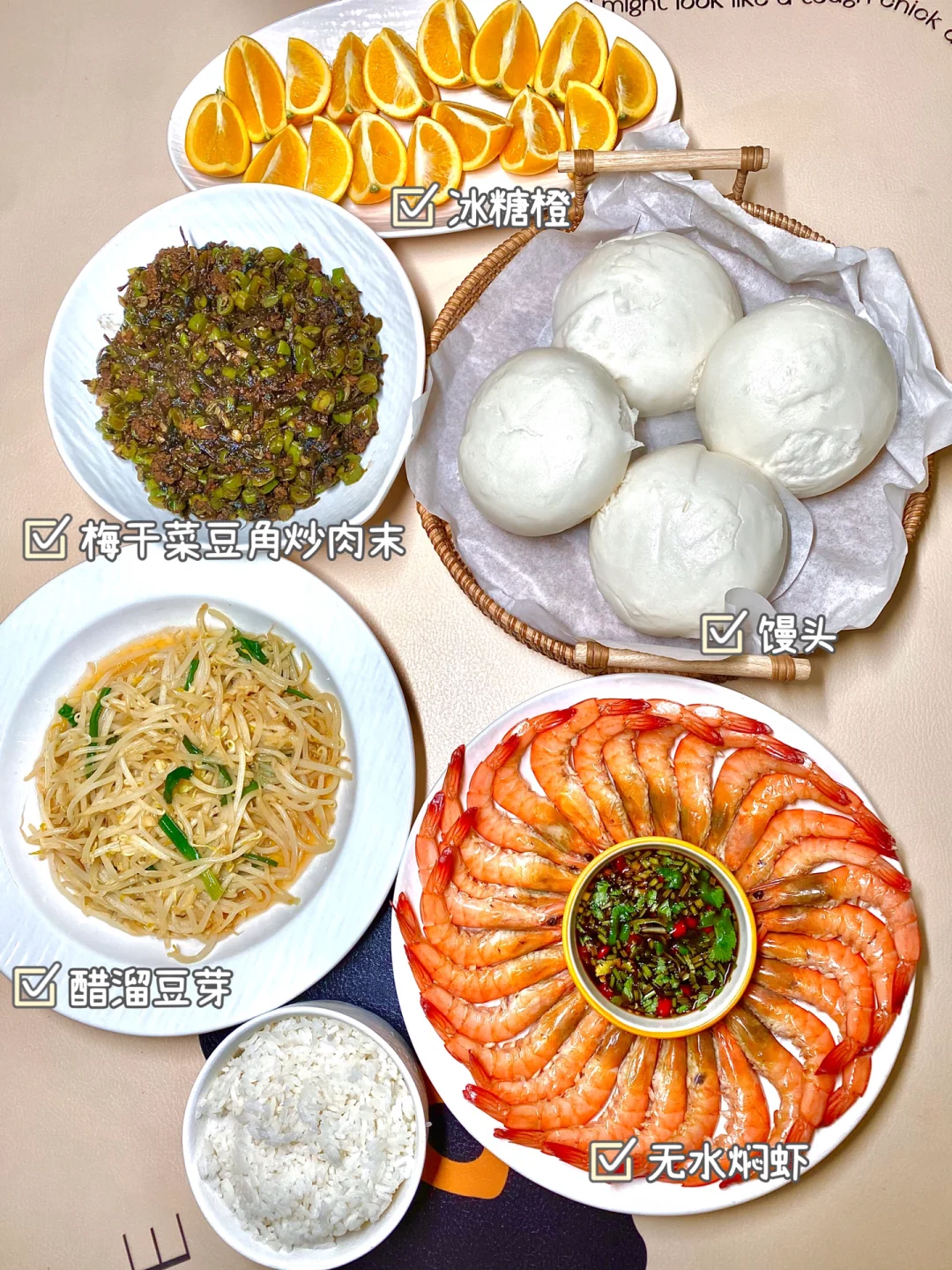 无水焖虾、醋溜豆芽、冰糖橙