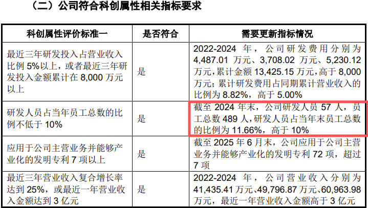 2022-2024年,公司研发费用累计金额13425.15万元,高于8000万元;累计研发费用占同期累计营业收入的比例为8.82%,高于5.00%。截至2024年末,公司研发人员57人,员工总数489人,研发人员占当年末员工总数的比例为11.66%,高于10%。截至2025年6月末,公司应用于公司主营业务并能够产业化的发明专利72项,超过7项。