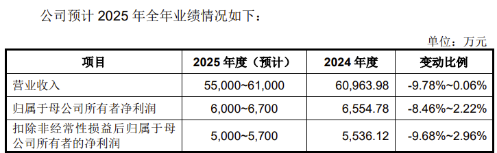 公司预计2025年全年实现营业收入5.50亿元-6.10亿元,同比增长-9.78%-0.06%,扣非归母净利润0.50亿元-0.57亿元,同比增长-9.68%-2.96%。