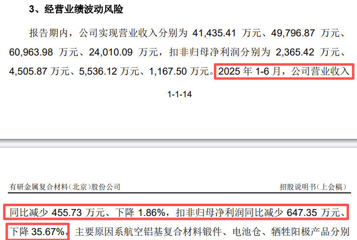 2025年1-6月,公司营业收入同比减少455.73万元、下降1.86%,扣非归母净利润同比减少647.35万元、下降35.67%,主要原因系航空铝基复合材料锻件、电池仓、牺牲阳极产品分别受下游装备计划和客户排产计划、折叠机销量下降及对美出口关税政策影响产品收入、毛利额有所减少,叠加期间费用增加影响。