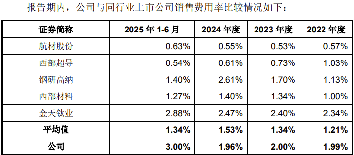 公司将航材股份、西部超导、钢研高纳、西部材料、金天钛业列为同行业上市公司。2022年、2023年、2024年及2025年上半年,同行业上市公司销售费用率平均值分别为1.21%、1.34%、1.53%及1.34%,而公司销售费用率分别为1.99%、2.00%、1.96%及3.00%。公司销售费用率显著高于同行业上市公司平均值。特别是2025年上半年,公司销售费用率达到3%,远高于同行业上市公司平均值的1.34%且高于任何一家同行业公司。