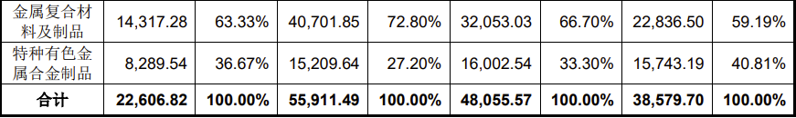 有研金属复合材料(北京)股份公司申报科创板IPO于2025年6月30日获得受理,现已完成两轮问询。公司本次IPO拟募资9亿元。公司是国务院国资委直属央企中国有研科技集团有限公司所属二级产业化公司,目前注册资本37,123.8468万元。公司专注于金属复合材料及制品、特种有色金属合金制品研发、生产和销售,是国企改革“双百行动”企业、国家高新技术企业、北京市“专精特新”企业。公司核心产品包括金属基复合材料及制品、双金属复合材料及制品、特种铝合金和特种铜合金制品等。报告期内,公司主营业务收入构成情况如下:
