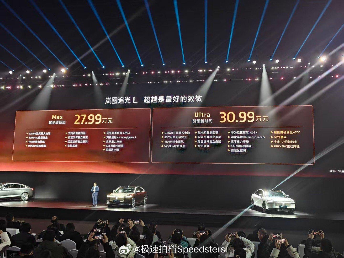 岚图的旗舰轿车,岚图追光L上市了,27.99-30.99万车长5米1,车宽接近2米,轴距3米,再加上双色车身和大饼镀铬轮圈的,看着很显贵。标配华为乾崑ADS 4+鸿蒙座舱5;63度大电池,410km纯电续航;800V+5C超充。前双叉臂+后五连杆+全铝底盘;双电机四驱,4.8秒零百加速;顶配还有空悬+CDC+全向10°后轮转向。30万,你觉得这车值吗?