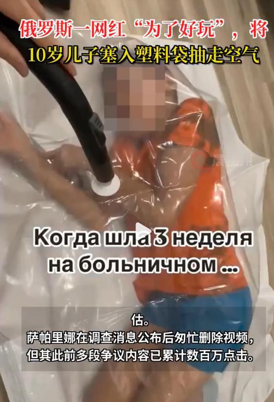 把10岁儿子塞真空袋引众怒,这是俄罗斯一女网红干的事情,为博眼球,漠视安全,俄罗斯网红也是无所不用其极,这种行为,不管是在俄罗斯还是在其他国家,都是令人不齿的,这不是好玩,而且一点也不好玩,这种为博眼球不择手段的做法,是人性的扭曲。