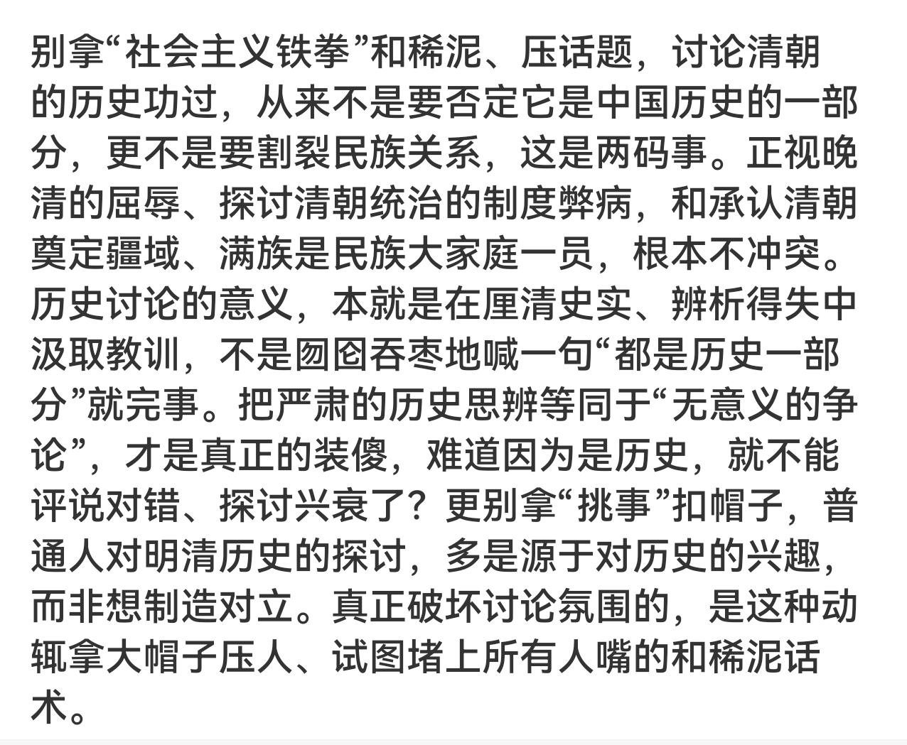 怎么又搞出红楼梦悼明争议了,真是稀奇古怪、莫名其妙的。有人说反对满清不是反对满族,问题是很多满族人受到网暴了,尤其是那些知名的艺人。你把历史和现实分清楚了,可确实有很多人分不清楚,或者是别有用心的不分清楚。还有人说纪念南京大屠杀,就该纪念嘉定大屠杀什么的。历史改不了,但纪念就有点不合适了。如果制造南京大屠杀的小日本现在是中国日本省,估计也不会纪念南京大屠杀了。